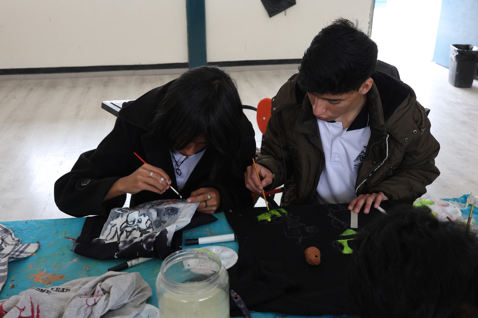 Ciudad Juárez, Chihuahua.— Estudiantes del Centro de Bachillerato Tecnológico Industrial y de Servicios (CBTis) 270 participan en el taller ‘Team Creadores’, organizado por la asociación civil Arte en el Parque, en el que aprenderán sobre la intervención creativa de ropa y objetos personales a través de la pintura.