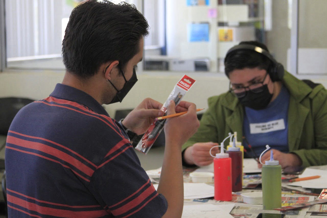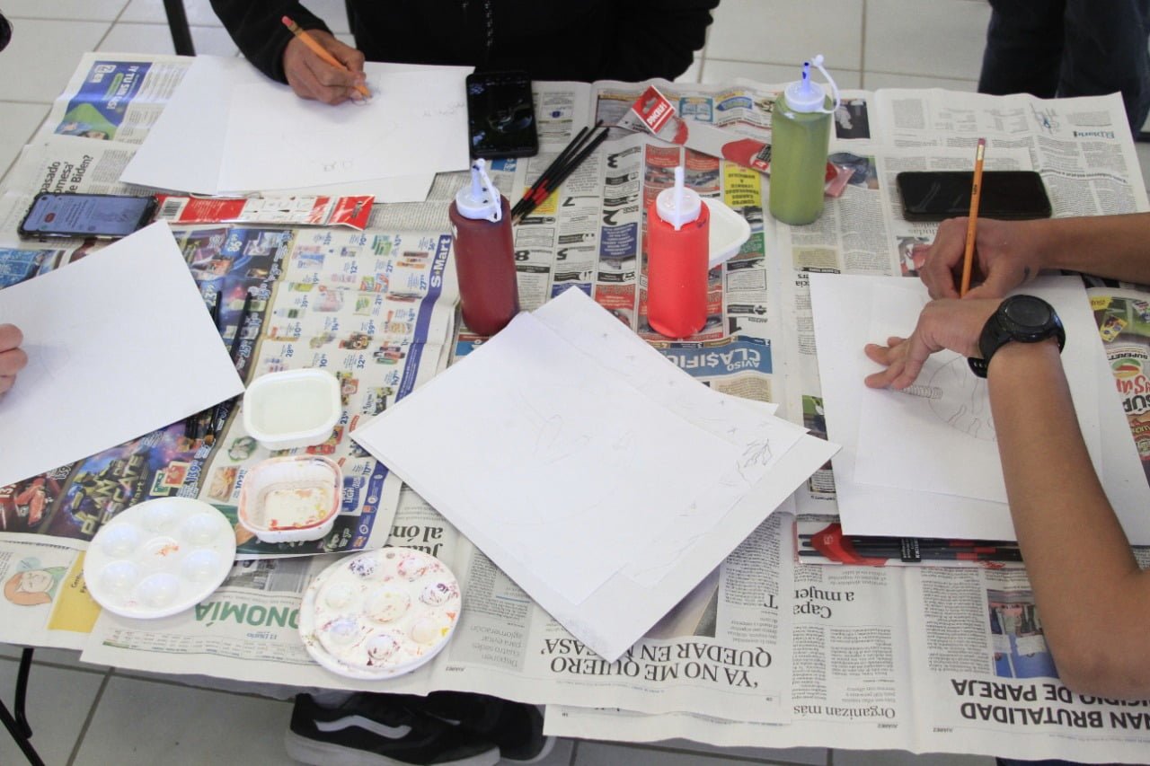 Ciudad Juárez, Chihuahua. – 13 estudiantes del Centro de Bachillerato Tecnológico Industrial y de Servicios (CBTis) 270 participaron en la segunda sesión de taller de pintura de Arte en el Parque A.C., donde plasmaron historias por medio del dibujo y la pintura. La sesión se realizó este sábado 12 de marzo en la biblioteca del plantel educativo. El taller se realiza en sesiones semanales los sábados, en un horario de 10:00 a 1:00 de la tarde en el CBTis 270, ubicado en la calle Soneto 156 de la colonia Carlos Castillo Peraza. En esta ocasión el tallerista David Zapién y los participantes trabajaron con la técnica de inmersión, la cual consiste en un proceso de inducción a la creatividad espontánea. Por medio de esta técnica los estudiantes plasmaron en pintura la historia de un libro, una película o la letra de una canción.