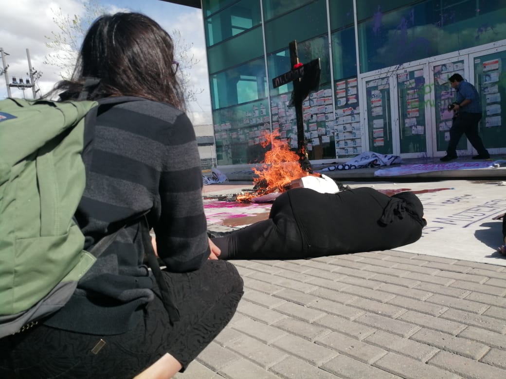 Mujeres realizaron un performance de intervención adentro y afuera del edificio de la Fiscalía Especializada de la Mujer en Ciudad Juárez.