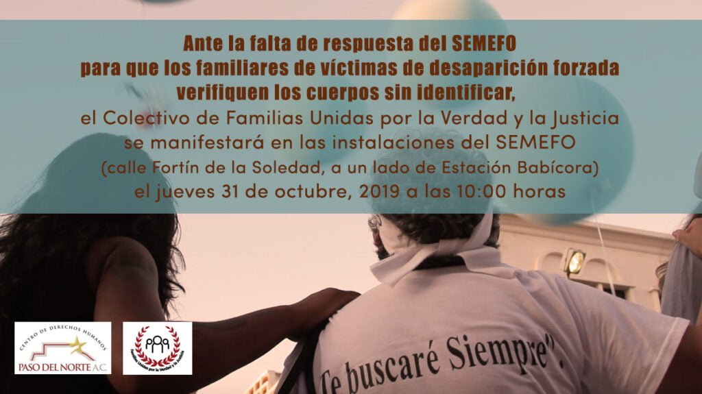 Ciudad Juárez, Chihuahua.— Este jueves el Centro de Derechos Humanos Paso del Norte (CDHPN) y el colectivo ‘Familias Unidas por la Verdad y la Justicia’ se manifestarán al exterior del Laboratorio del Servicios Médico Forense (Semefo), para exigir que se les permita verificar los cuerpos de personas que permanecen sin ser identificados. De acuerdo con Maricela Vázquez Sánchez, abogada del CDHPN, los familiares buscan que les sea permitido revisar los cuerpos y las evidencias de los casos de forma conjunta y no individualmente, como lo propone el Semefo. Vázquez Sánchez explicó que los familiares desconfían de las autoridades estatales, puesto que existen casos en lo que los cuerpos resguardados no han sido identificados a pesar de que el Semefo los ha presentado. Tal es el caso de Víctor Manuel Baca Prieto, quien en 2009 fue aprehendido por soldados y posteriormente asesinado. Fue hasta 2016, siete años después de su desaparición, que el Servicio Médico Forense reconoció que había correspondencia genética con uno de los cuerpos que resguardaba desde octubre de 2009.