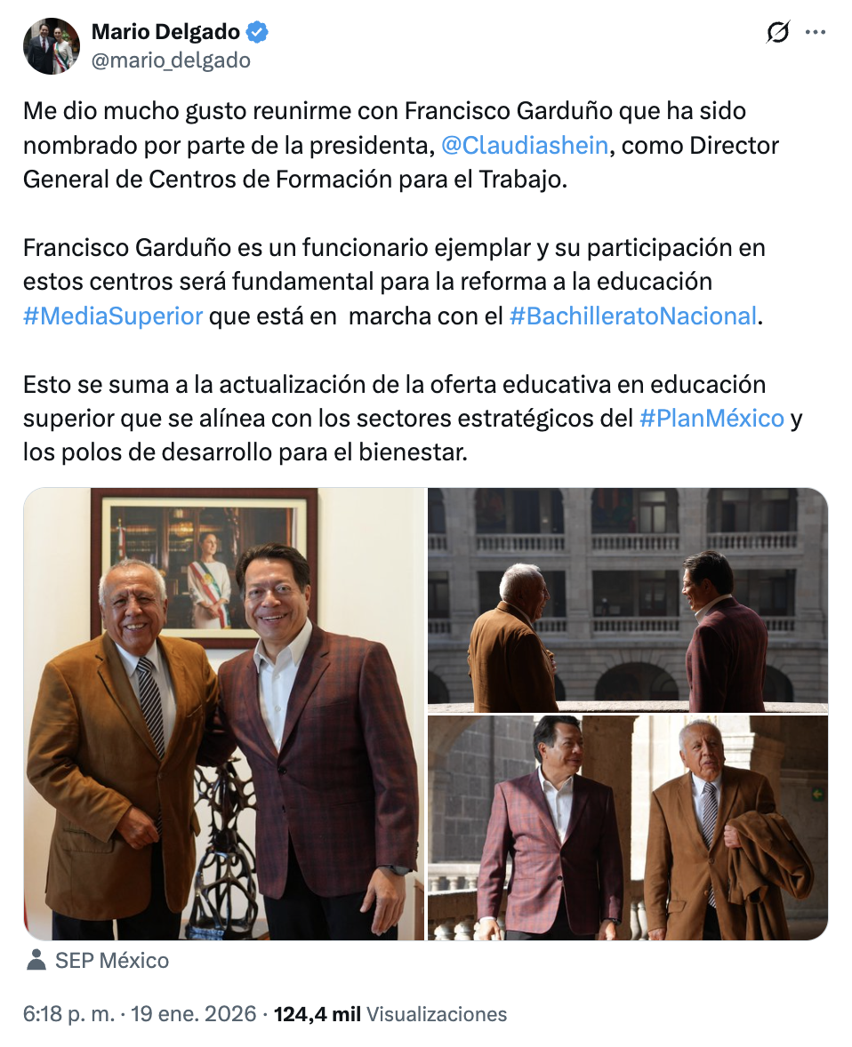 Este lunes 19 de enero, el titular de la dependencia, Mario Delgado Carrillo informó que Garduño fue nombrado por la presidenta, Claudia Sheinbaum Pardo, como director general de Centros de Formación para el Trabajo de la SEP.
