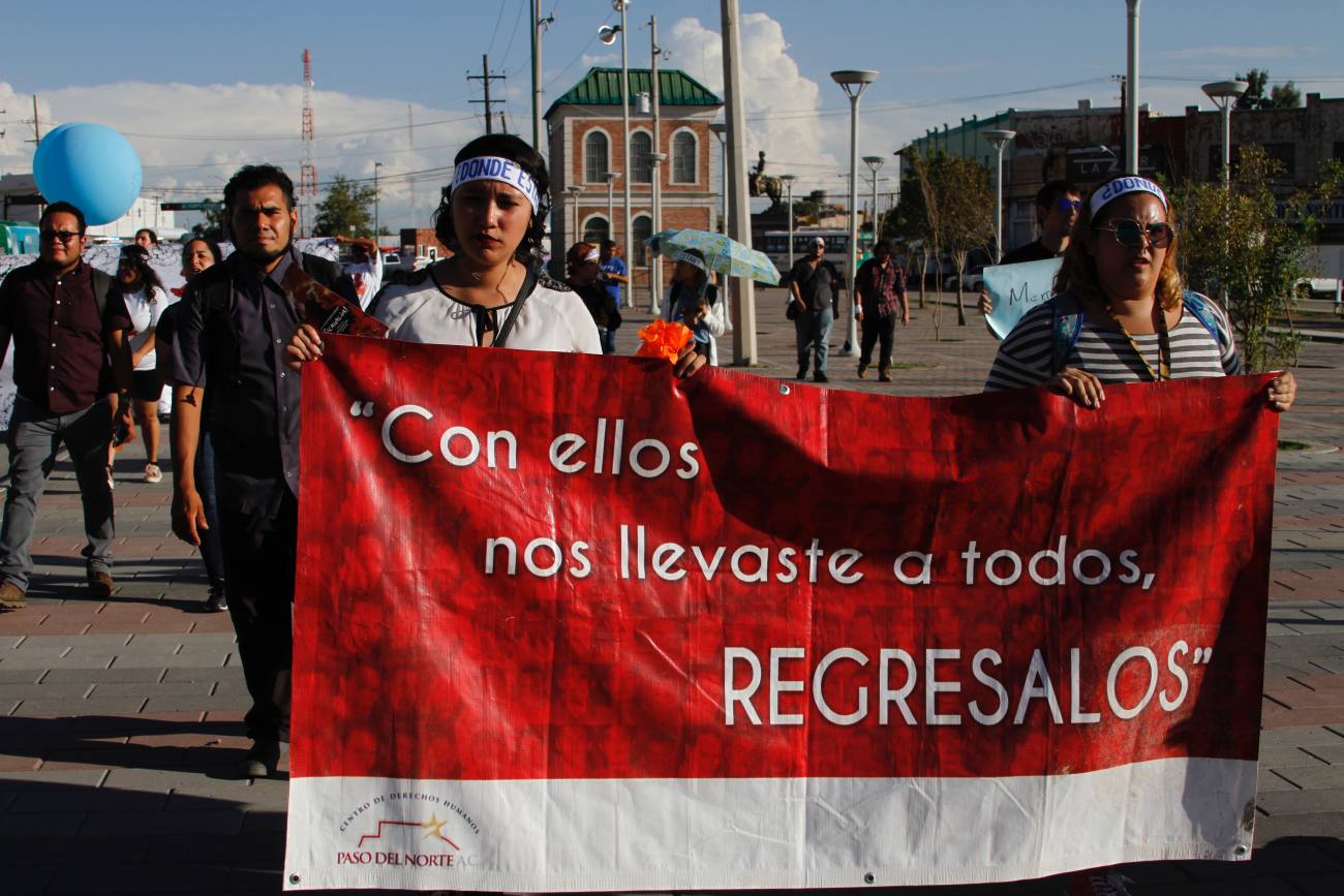 Ciudad Juárez, Chihuahua.— Colectivos de familiares de víctimas y organizaciones de la sociedad civil, así como ciudadanía en general, marcharon hoy en conmemoración del Día Internacional de las Víctimas de Desapariciones Forzadas. El recorrido dio inicio en el monumento a Benito Juárez y avanzó por la avenida Vicente Guerrero para luego girar en la avenida Francisco Villa y finalmente en el corredor de la 16 de Septiembre, para llegar a la Catedral.