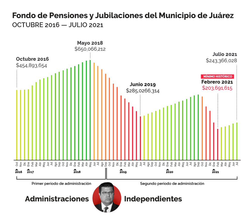 La siguiente investigación fue publicada originalmente en La Verdad Juárez. Ciudad Juárez, Chihuahua.— Al final de su gestión como alcalde de Juárez durante dos periodos consecutivos, Armando Cabada Alvídrez pregona que trabajó sin endeudar a la ciudad, pero no dice que durante su último trienio se gastó el dinero acumulado para pagar a los pensionados y jubilados del Municipio. En octubre de 2016, cuando llegó por primera vez al Gobierno Municipal, recibió el Fondo de Pensiones y Jubilaciones con un saldo de poco más de 449 millones de pesos; ahora que se va lo deja casi a la mitad, en 243.3 millones de pesos, cifra correspondiente al mes de julio de este año. Sin embargo, el monto real que Armando Cabada se gastó del Fondo asciende a los 406.7 millones de pesos, ya que durante los primeros 20 meses de la primera administración, de octubre de 2016 a mayo de 2018, los recursos que se acumularon con las aportaciones del Municipio y sus trabajadores ascendieron a los 650 millones de pesos.
