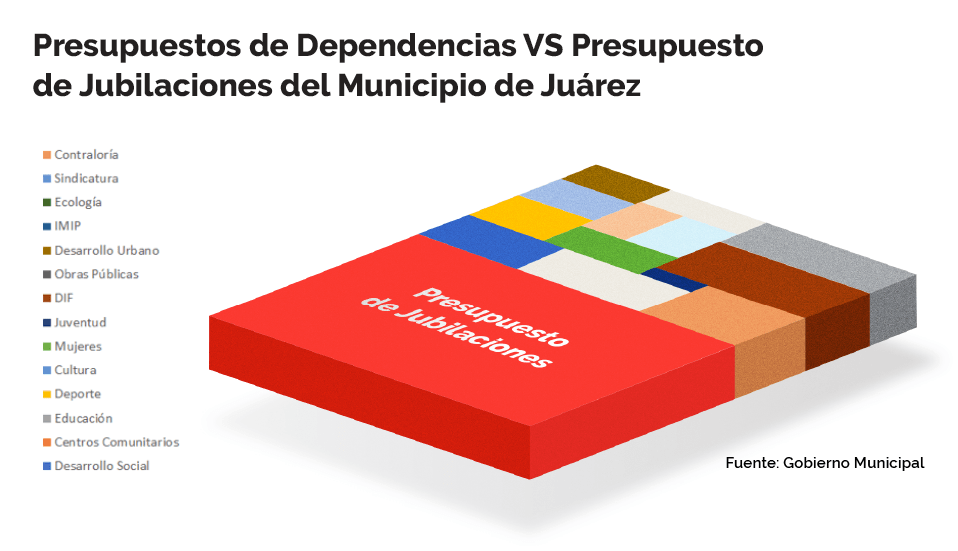 El porcentaje que representa la partida de Apoyos y Prestaciones a Pensionados y Jubilados en el Presupuesto de Egresos del Municipio ha aumentado de manera exponencial en la última década hasta representar una pesada carga en las finanzas del Gobierno de Juárez. Tan solo desde el año 2010 a la fecha, el presupuesto que el Municipio destina al pago de jubilaciones y pensiones aumentó un 133 por ciento, es decir, prácticamente dobló la cifra. De acuerdo con la información oficial del Municipio de Juárez, en 2010 el gasto por este concepto rebasaba los 238 millones de pesos; mientras que para el Presupuesto de Egresos de 2021, una década más tarde, esta cifra aumentó a 556 millones 624 mil 080 pesos, cantidad que es equivalente al presupuesto acumulado de 14 dependencias municipales. Entre estas dependencias se encuentran Desarrollo Social, los institutos del Deporte, Cultura, Mujeres y Juventud; Centros Comunitarios, Desarrollo Urbano, Educación, DIF Municipal, Obras Públicas, Instituto Municipal de Investigación y Planeación (IMIP), Ecología, Sindicatura y Contraloría, cuyo presupuesto acumulado este 2021, suma los 556 millones 474 mil de pesos, una cantidad similar a la que el Cabildo aprobó este año al pago de jubilaciones y pensiones.