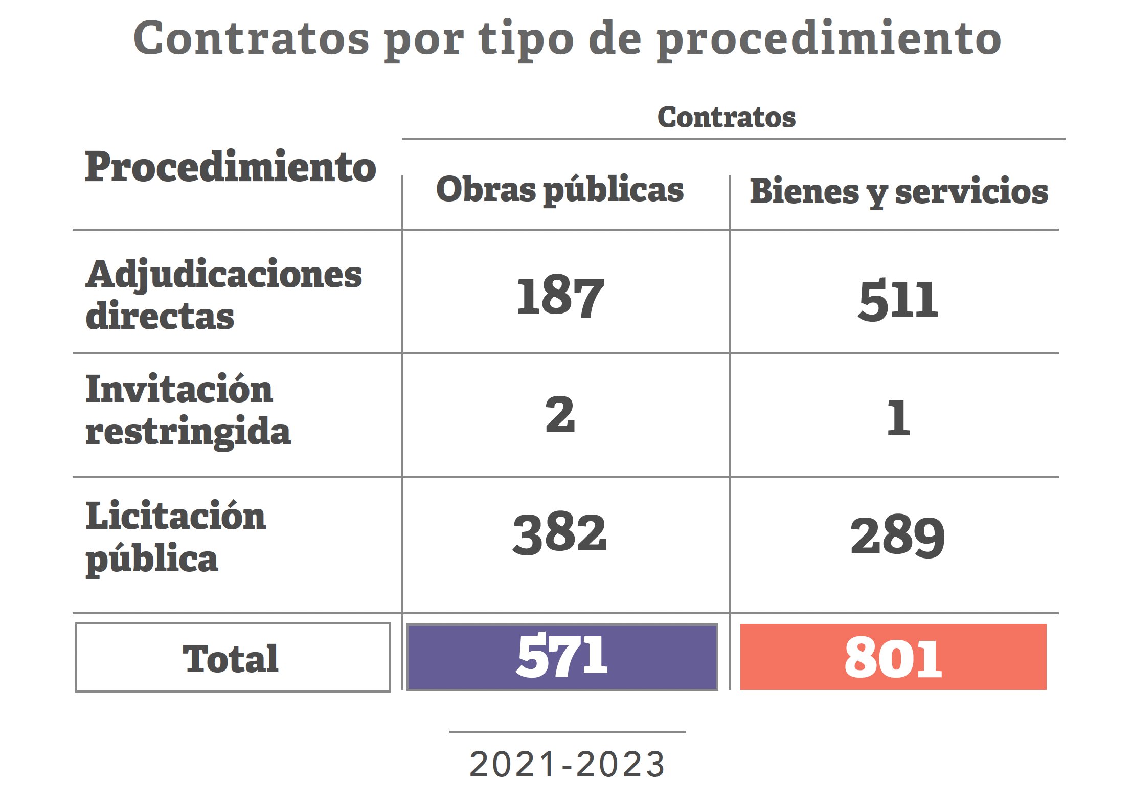 De estos, el 51 por ciento de los contratos (698) se celebró a través de adjudicaciones directas, es decir, sin la necesidad de un concurso ni competencia de por medio. Estos se concentran principalmente en la contratación de ‘Bienes y servicios’, con 511, mientras que en obras públicas se adjudicó un total de 187.