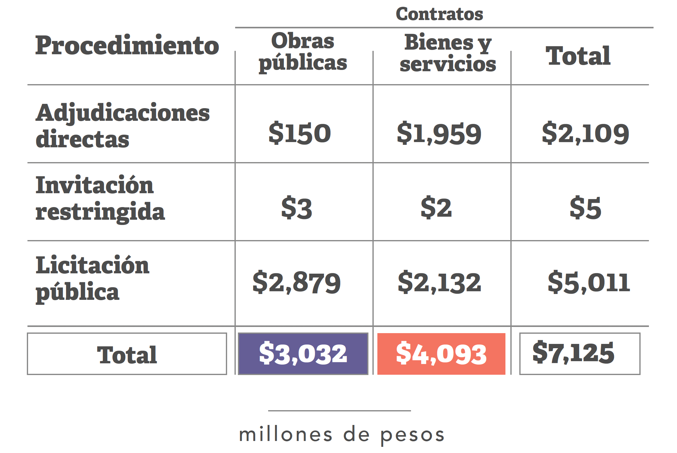 La administración de Cruz Pérez Cuéllar gastó un total de 7 mil 125 millones de pesos en dichos contratos: 5 mil 011 millones mediante licitación pública, 2 mil 109 millones en adjudicaciones directas, y 5 millones en contratos de invitación restringida.