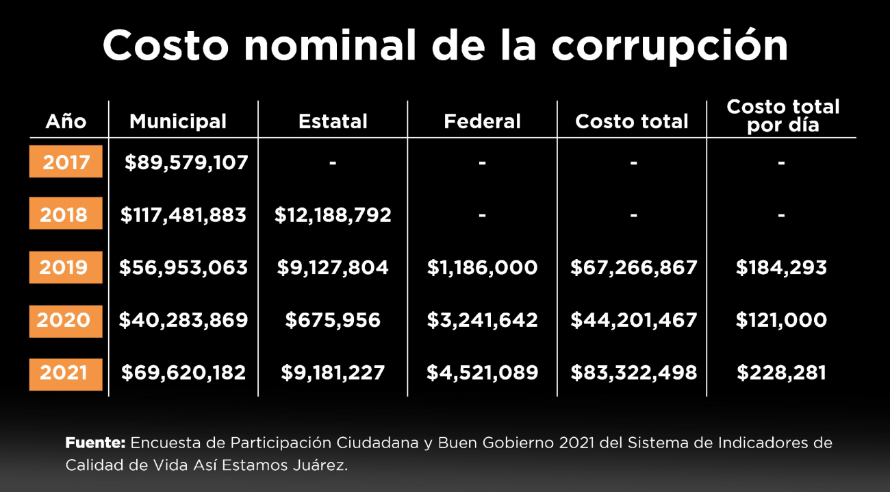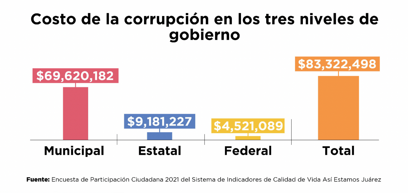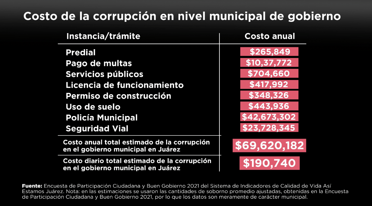 “En los servicios que otorga a través de diferentes dependencias y direcciones o secretarías, hay un contacto muy muy cotidiano y muy cercano con las personas: desde los trámites en oficinas como Desarrollo Urbano, Comercio, la misma Secretaría del Ayuntamiento, Obras Públicas y ni se diga la proximidad también que hay en instituciones como la Secretaría de Seguridad Pública Municipal y la Coordinación de Seguridad Vial”, explicó. La coordinadora de sistema de indicadores de calidad de vida Así Estamos Juárez 2022, Érika Donjuan Callejo, explicó que para las estimaciones del informe se usaron las cantidades de soborno promedio que aseguró haber pagado la ciudadanía consultada para la ‘Encuesta de Participación Ciudadana y Buen Gobierno 2021’.