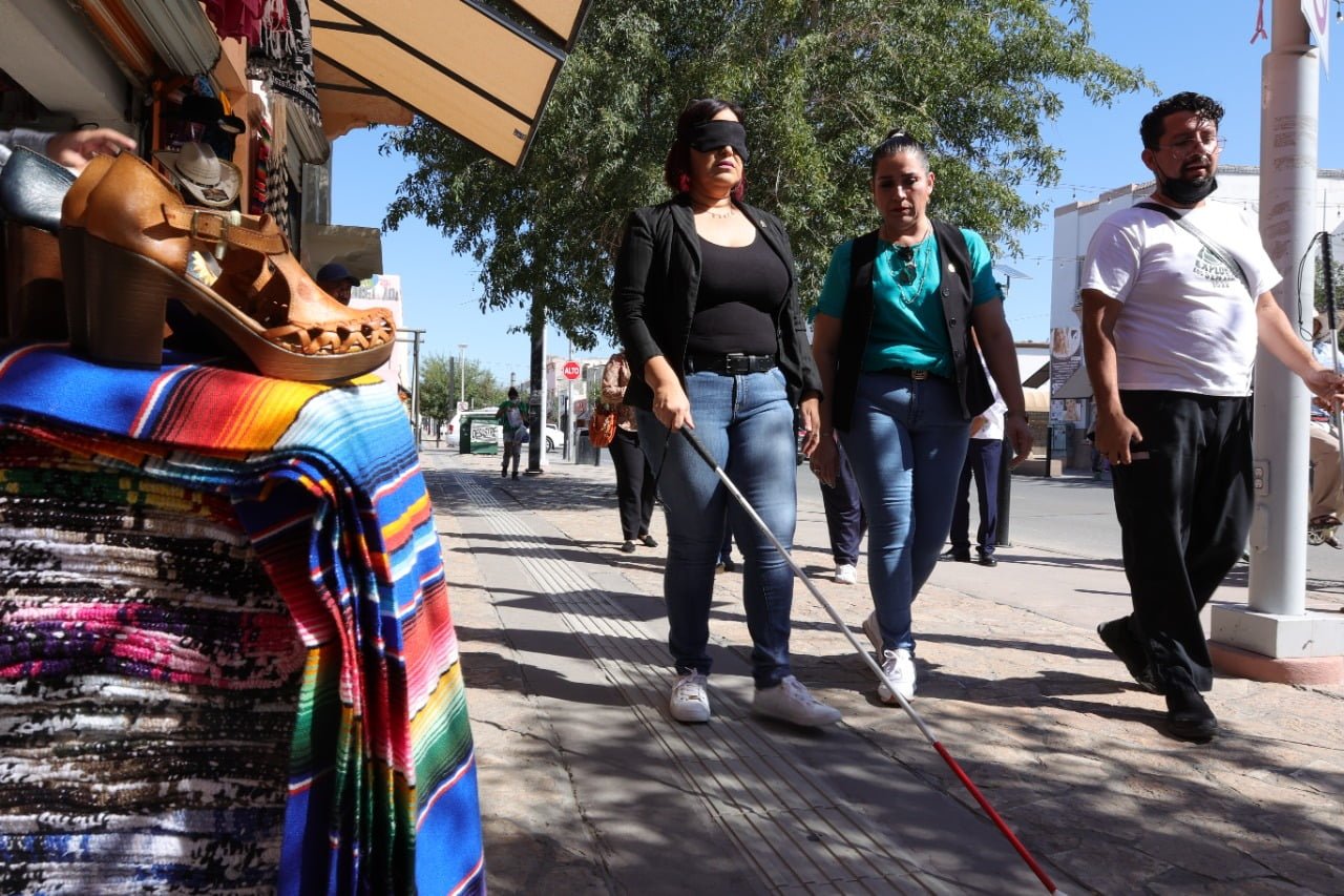 Las regidoras Karla Michaeel Escalante Ramírez, Vanessa Mora del O y el regidor Jorge Marcial Bueno Quiroz caminaron un tramo de la avenida con los ojos vendados y con el apoyo de un bastón guía para comprender lo difícil y peligroso que es para las personas ciegas transitar por la ciudad.