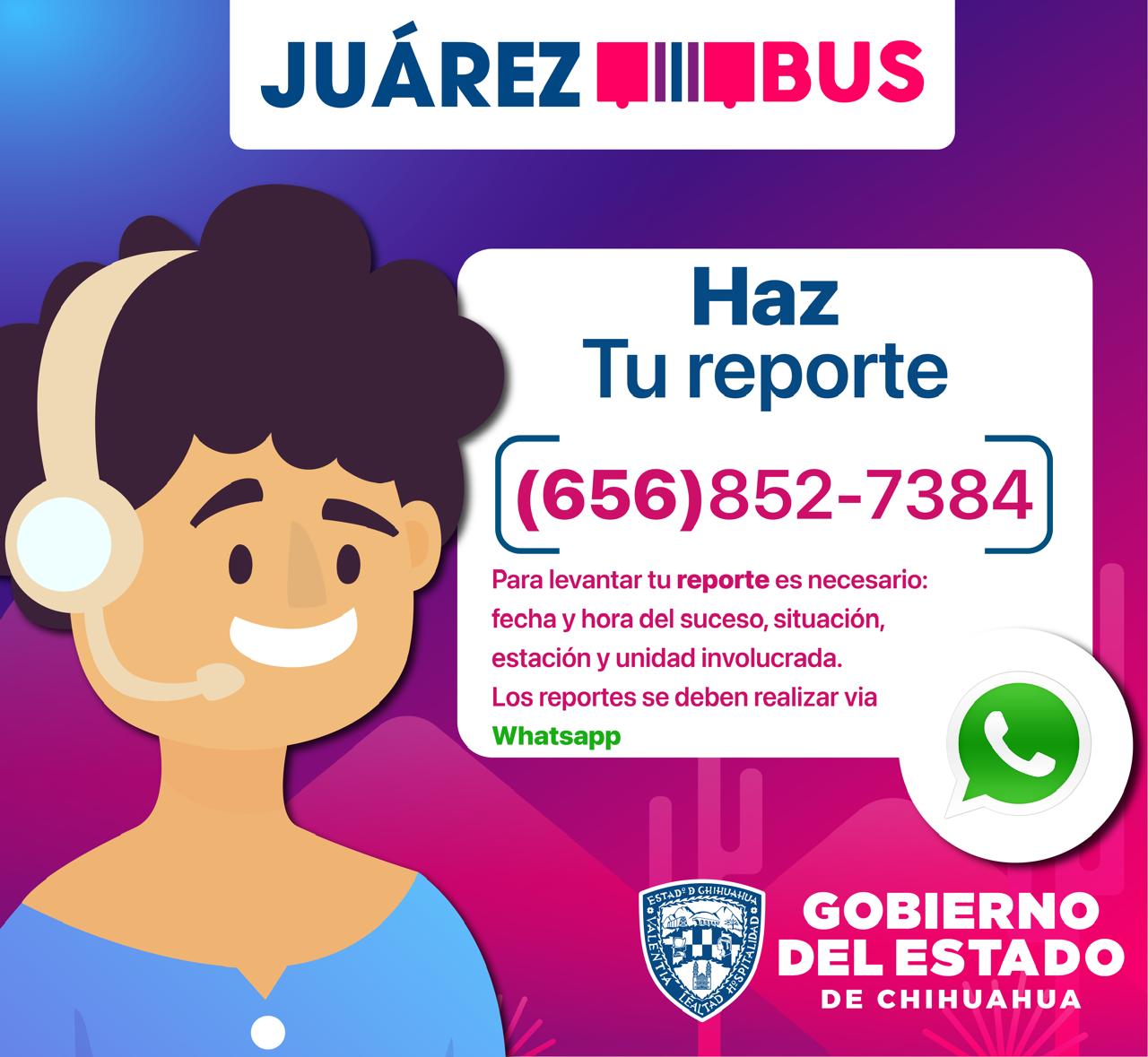El teléfono al que podrán enviar reportes de colisiones, siniestros o mal uso de las unidades y estaciones del Juárez Bus es (656) 852-7384. Todos los reportes deberán estar relacionados a este sistema de transporte público.