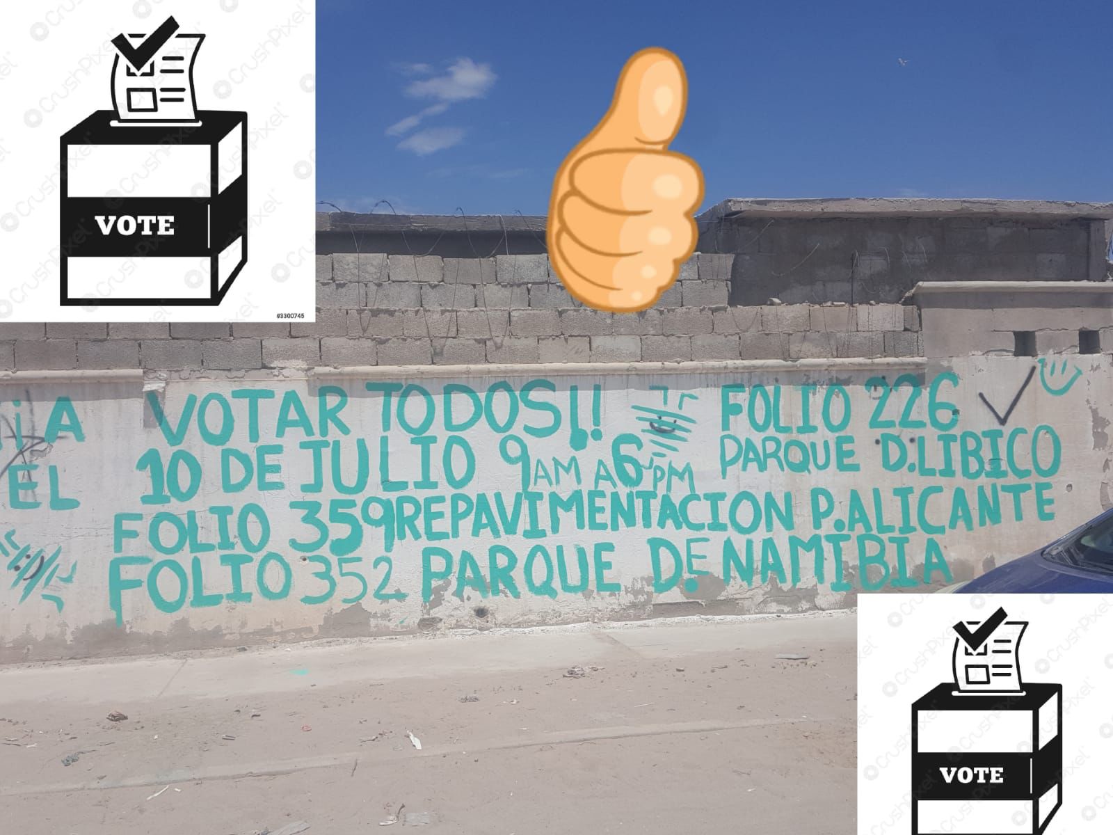 Niñas, niños y madres de familia salieron la tarde del viernes 08 de julio a repartir volantes con la información de sus proyectos en los cruceros del bulevar Zaragoza y Santiago Troncoso. También grabaron un audio que reproducen mientras conducen una camioneta por las calles de Parajes de Oriente. Otra estrategia de promoción emprendida por las vecinas del fraccionamiento fue el pintar una barda ubicada en la calle Puerto Alicante con los folios de cada proyecto. Las vecinas de Parajes de Oriente también tienen planeado salir a iglesias para repartir volantes el mismo día de las votaciones.