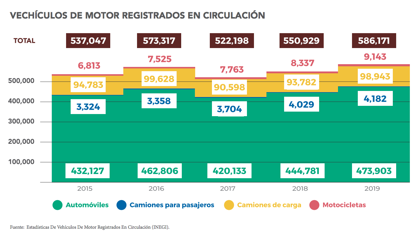 Ciudad Juárez, Chihuahua.— De acuerdo con información del Informe Así Estamos Juárez 2021, de la asociación civil plan Estratégico de Juárez, en este municipio se registraron en 2019, 586 mil 171 vehículos motorizados, entre los que figuran automóviles particulares, camiones de carga y de pasajeros y motocicletas. Los coches particulares representan ocho de cada 10 vehículos en Juárez, y existe uno por cada tres personas juarenses. La categoría con menos vehículos registrados fue la de camiones pasajeros, que se ha mantenido entre 3 mil 100 y 4 mil 200 durante los últimos 10 años. Por otra parte, hubo un aumento sustancial en la cantidad de motocicletas registradas, que cerró en 2019 con 9 mil 143 unidades.