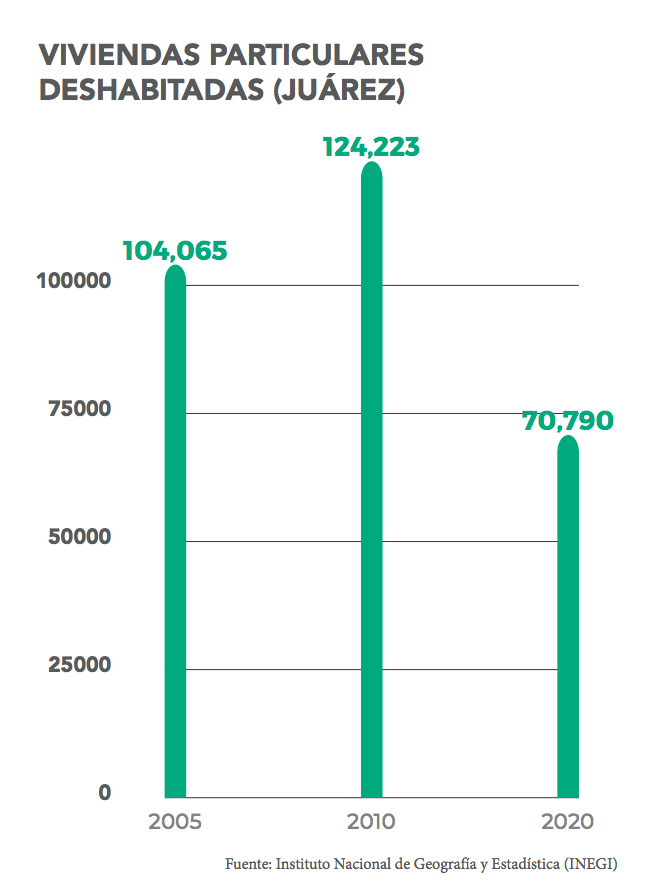 Ciudad Juárez, Chihuahua.— Aunque en los últimos 10 años ha disminuido significativamente el número de viviendas deshabitadas en el municipio de Juárez, siguen habiendo más de 70 mil, de acuerdo con información del Instituto Nacional de Geografía y Estadística (Inegi), incluida en el informe Así Estamos Juárez (AEJ), que fue presentado la semana pasada por la asociación Plan Estratégico de Juárez. Los datos muestran que en 2005 el número de casas deshabitadas era de 104 mil 065, mientras que en 2010 incrementó a 124 mil 223 y para 2020 disminuyó hasta 70 mil 790. “Si bien ya no tenemos las cifras como en 2010 de 124 mil viviendas, seguimos teniendo más de 70 mil viviendas deshabitadas que generan problemas a nuestra ciudad”, señaló la doctora Erika Donjuán Callejo, coordinadora del sistema de indicadores AEJ.