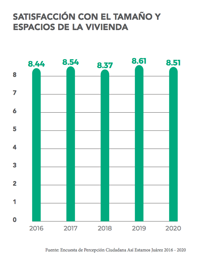 Asimismo en los últimos cinco años, de 2015 a 2020, el número de viviendas habitadas en Juárez aumento de 394 mil 254 a 449 mil 602, con un promedio de 3.36 personas por vivienda a nivel estatal. De 2019 a 2020 también decreció el número de viviendas autorizadas con crédito Infonavit en este municipio, de 9 mil 701 a 8 mil 221. En cuanto a la satisfacción con el tamaño y espacios de las viviendas, de 2016 a 2020 la calificación se ha mantenido entre 8.37 y 8.61. En 2020 la calificación fue de 8.51, y la satisfacción de las personas con su vivienda fue de 8.79. De acuerdo con datos de la Encuesta de Percepción Ciudadana de AEJ, la satisfacción de las personas con los materiales de sus viviendas fue de 8.53 en 2016, 8.62 en 2017, 8.41 en 2018, 8.65 en 2019 y 8.64 en 2020.