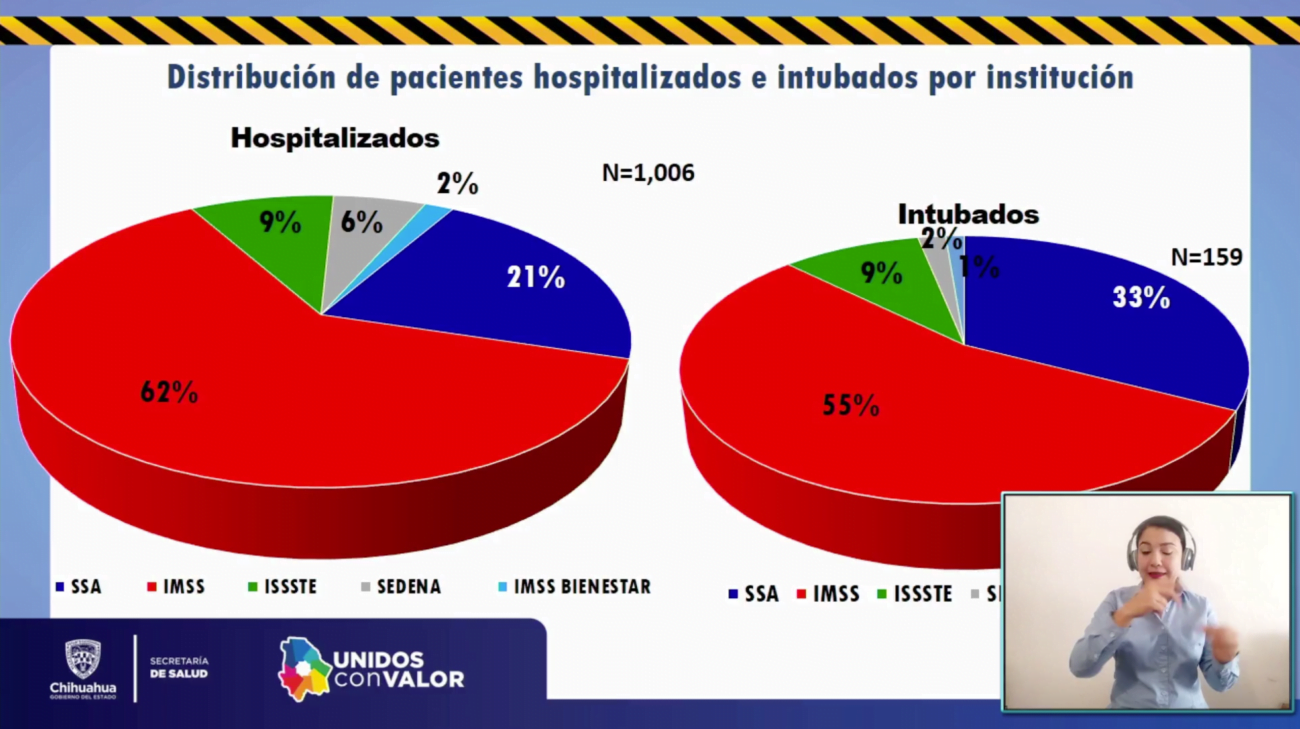 Ciudad Juárez, Chihuahua.— Este miércoles la Secretaría de Salud dio a conocer que en las últimas 24 horas se confirmaron 443 nuevos contagios de COVID-19 y 70 defunciones en el estado, de acuerdo con el director médico de la Zona Norte, Arturo Valenzuela Zorrilla. Con estos nuevos contagios y defunciones Chihuahua a un total acumulado desde el inicio de la pandemia de 27 mil 293 casos confirmados y 2 mil 126 personas fallecidas a causa de la enfermedad en el mismo lapso de tiempo, indicó Valenzuela. De las personas reportadas fallecidas en las últimas 24 horas, 47 residían en Ciudad Juárez, 20 en Chihuahua, 1 en Nuevo Casas Grandes, 1 en Cuauhtémoc y 1 en Ascensión. Hasta el momento se tiene el registro de 1 mil 006 pacientes hospitalizados y 159 en estado grave e intubados, lo que se registra como el máximo histórico de hospitalización desde el inicio de la pandemia, de acuerdo con el director médico.