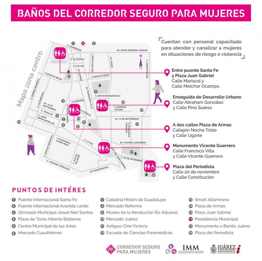 Ciudad Juárez, Chihuahua.— Para concretar uno de los ejes del Corredor Seguro para las Mujeres, el Instituto Municipal de las Mujeres (IMM) y la asociación civil Sin Violencia firmaron un convenio de colaboración para que personal capacitado opere los baños públicos que forman parte de la infraestructura. Será la organización civil, que trabaja con mujeres víctimas de violencia de género, la encargada de administrar los cinco baños públicos que están a lo largo del Corredor Seguro y que también funcionan como espacios seguros para las mujeres. Cada baño es operado por mujeres adultas que han sido previamente capacitadas en temas relativos a la violencia de género para que en caso de conocer en los baños a una mujer víctima de violencia puedan canalizarlas al IMM o alguna otra organización especializada. La directora del IMM, Verónica Corchado Espinoza, recalcó que las personas que atienden los baños “son mujeres que han salido de espacios de atención, que han tenido la oportunidad de emplearse en este tipo de espacios y que son acompañados por personal del IMM para que desarrollen capacidades y habilidades para enfrentar la violencia”. Las personas deberán pagar cinco pesos por su uso, ya que este dinero servirá para la autosustentabilidad de los baños y además será una fuente de ingresos para un refugio de mujeres víctimas de violencia. Los baños se encuentran en las siguientes calles: Abraham González y Pino Suárez; Ignacio Mariscal y Melchor Ocampo; las avenidas Francisco Villa y Vicente Guerrero; en el Callejón Noche Triste y Ugarte; y en la calle 20 de noviembre y Constitución, sobre la Plaza del Periodista. La coordinadora del Corredor Seguro, Brissa Maltos, explicó que los baños se colocaron estratégicamente en sitios donde identificaron —a través de una investigación realizada en colaboración con Ficosec— que las mujeres se sentían más inseguras. Las personas que transiten por el Centro Histórico podrán hacer uso de los baños públicos en un horario de 10:00 de la mañana a 6:00 de la tarde.