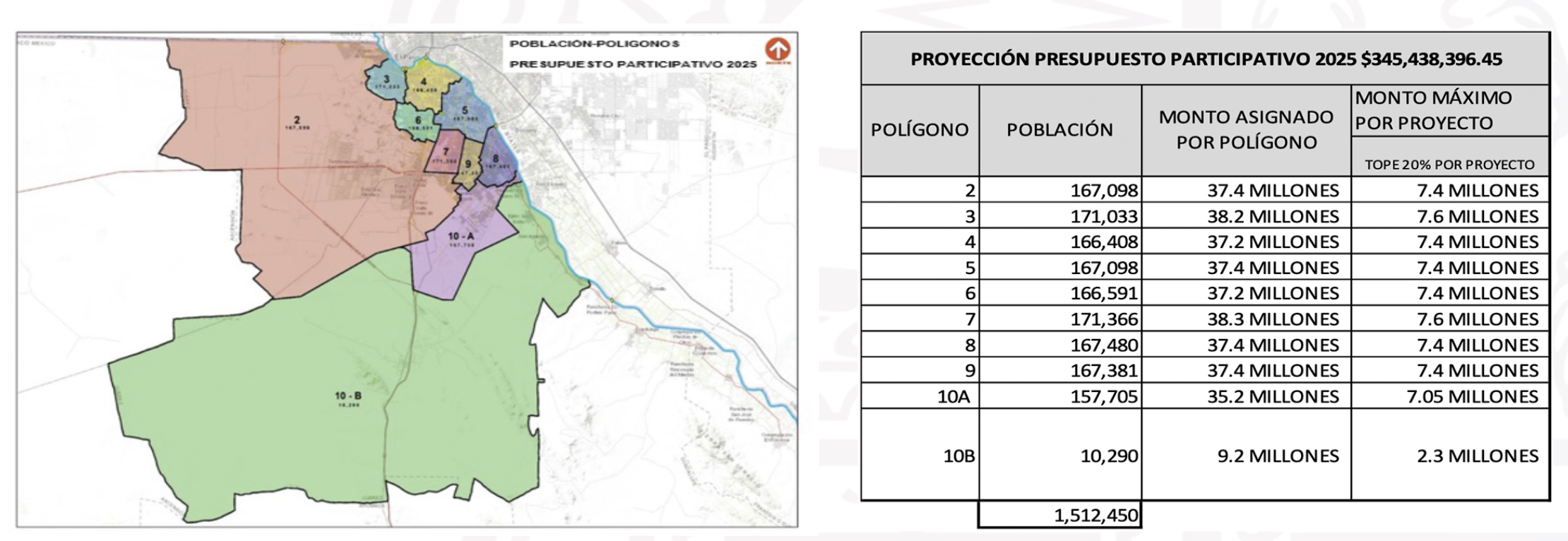 De acuerdo con la convocatoria del Presupuesto Participativo 2025, este año el Municipio destinará un total de 345 millones 438 mil 396.45 pesos, los cuales estarán divididos en 10 polígonos delimitados según los distritos electorales.