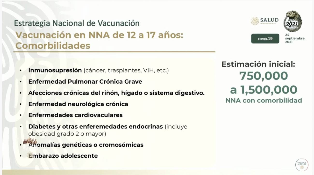 El subsecretario de Prevención y Promoción de la Salud, Hugo López-Gatell, informó que el gobierno pretende iniciar la vacunación contra el Covid-19 en personas de 12 a 17 años en aquellos que presentan algún tipo de comorbilidad asociada a un mayor riesgo de COVID-19 grave, hospitalizaciones y defunciones, incluyendo a adolescentes embarazadas.
