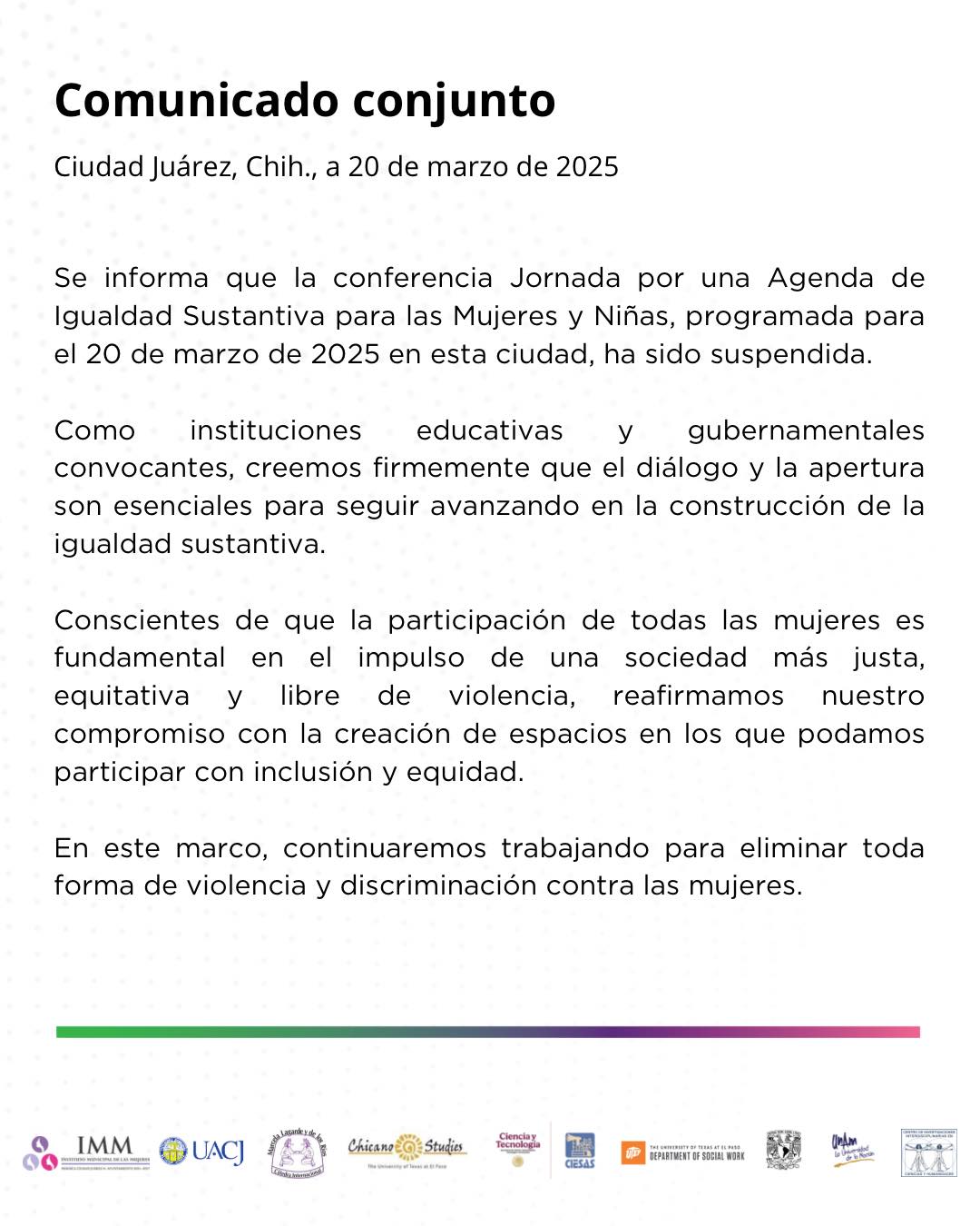 Sin dar mayor detalle de la cancelación, en el comunicado solo se menciona que las instituciones educativas y gubernamentales convocantes están convencidas de que “el diálogo y la apertura son esenciales para seguir avanzando en la construcción de la igualdad sustantiva”.