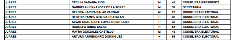 La consejera presidenta, Cecilia Sarabia Ríos, ha sido consejera propietaria en varios procesos electorales, federales y locales, el cargo más reciente se dio en la AMEJ de los comicios 2017-2018. Datos difundidos sobre su biografía indican que Sarabia Ríos es doctora en Gobierno y Administración Pública por el Instituto Universitario de Investigación Ortega y Gasset en Madrid, España. Se desempeña como profesora-investigadora de El Colegio de la Frontera Norte, adscrita al Departamento de Estudios de Administración Pública. Entre sus proyectos de investigación destacan: La participación política de las mujeres hacia su representación popular: avances y retrocesos en los municipios del estado de Chihuahua, 1983-2010, así como Intervención educativa para el ejercicio del voto libre y razonado, 2006.
