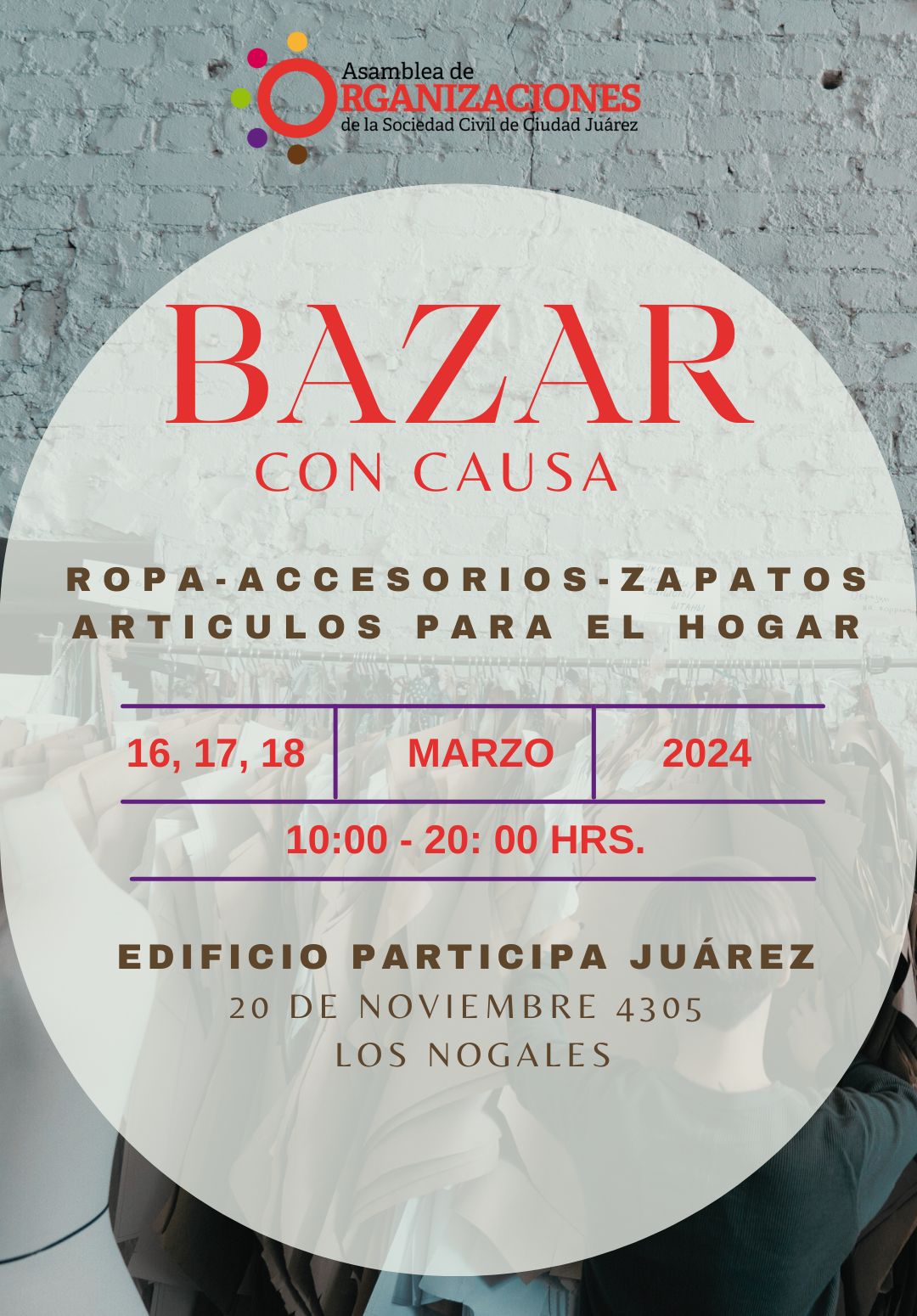 El ‘Bazar con Causa’, en el que se ofrecerán artículos deportivos y para el hogar, ropa, instrumentos musicales y juguetes, se llevará a cabo los días 16, 17 y 18 de marzo en el edificio Participa Juárez, ubicado en el #4305 de la avenida 20 de Noviembre.