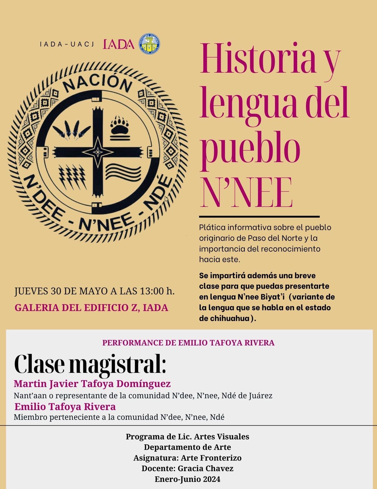 La clase magistral se llevará a cabo como parte del cierre de la materia de Arte Fronterizo. A partir de las 12:00 del mediodía se realizarán diversos performances identitarios por parte de los estudiantes. El evento es abierto al público.