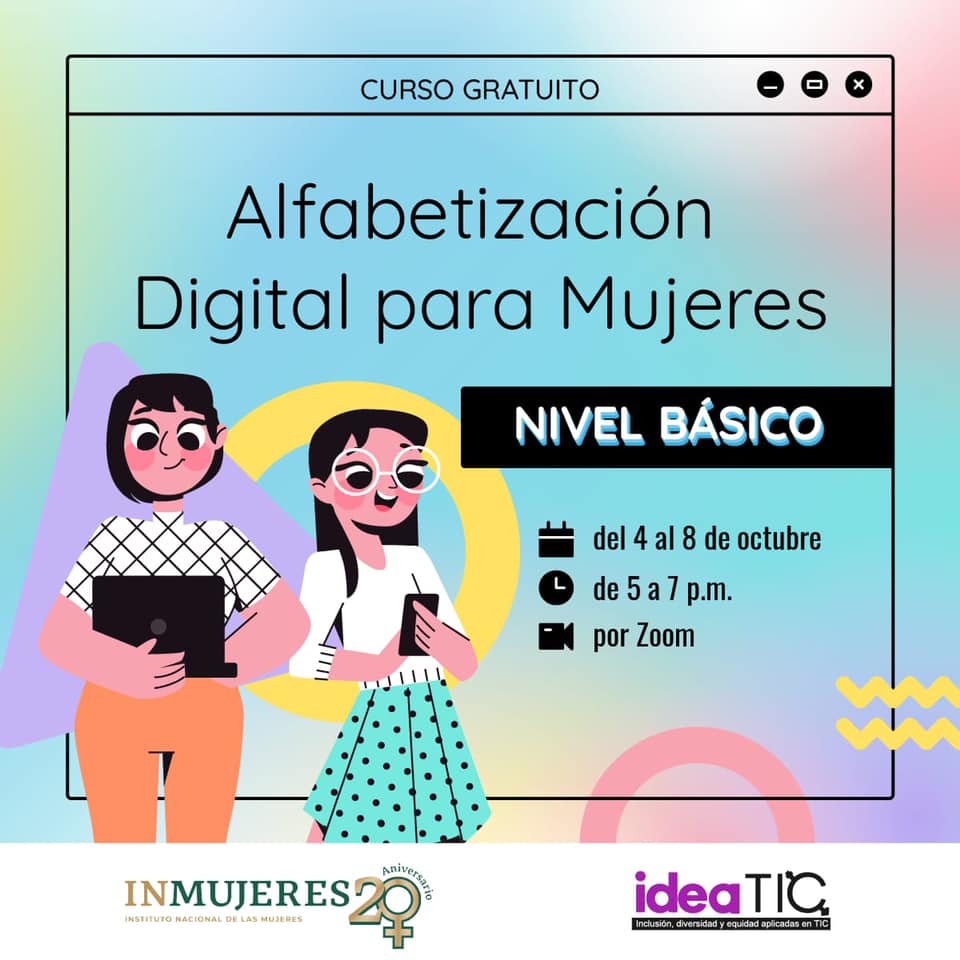 Ciudad Juárez, Chihuahua.— La organización Inclusión, diversidad y equidad aplicadas en TIC (IdeaTIC) impartirá un taller virtual para que las mujeres desarrollen habilidades digitales. Alfabetización Digital para Mujeres es el nombre del taller que se impartirá a través de la plataforma Zoom, del 4 al 8 de octubre del presente año, en un horario de 5:00 a 7:00 de la tarde (horario de la CDMX). Las capacitaciones que recibirán las participantes les permitirán conocer nuevas herramientas digitales y aplicaciones tecnológicas que podrán usar en su día a día y así mejorar sus destrezas digitales. Las mujeres interesadas deberán registrarse previamente para recibir los enlaces de acceso a las diversas charlas, las cuales no tienen costo alguno, recalcó el Instituto Nacional de las Mujeres (Inmujeres), organizador del evento. El registro se realiza mediante el formulario digital de inscripción que tendrán que completar con sus datos personales y posteriormente enviarlo. Para mayor información comunicarse a través de mensaje privado a las redes sociales del Inmujeres, IdeaTIC, o bien, al Instituto Municipal de las Mujeres del Municipio de Juárez (IMM).