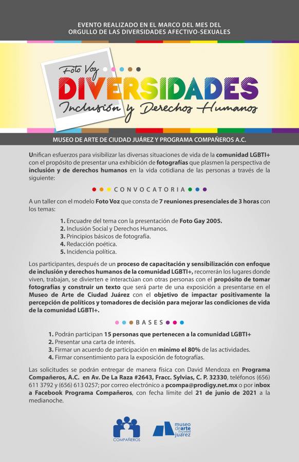 Ciudad Juárez, Chihuahua.— El Museo de Arte de Ciudad Juárez y la organización civil Programa Compañeros invitan a personas de la comunidad LGBTI+ a participar en la exposición ‘Foto voz, diversidades, inclusión y derechos humanos’, realizada en el marco del mes del Orgullo de las Diversidades Afectivo-Sexuales. El proyecto tiene el objetivo de capacitar a 15 personas de la comunidad LGBTI+, que serán previamente seleccionadas, en temas de derechos humanos, fotografía, redacción e incidencia política para que después de tener todas estas herramientas realicen un proyecto artístico, con fotografía y texto, en el que retraten su día a día. Las personas interesadas deberán asistir a siete reuniones presenciales de una duración de tres horas cada una en donde se abordarán los siguientes temas, necesarios para la creación del proyecto: 1.- Encuadre del tema con la presentación de Foto Gay 2005 2.- Inclusión Social y Derechos Humanos 3.- Principios básicos de fotografía 4.- Redacción poética 5.- Incidencia política “Después de un proceso de capacitación y sensibilización con enfoque de inclusión y derechos humanos de la comunidad LGBTI+, recorrerán los lugares donde viven, trabajan, se divierten e interactúan con otras personas son el propósito de tomar fotografías y construir un texto que será parte de una exposición a presentarse en el Museo de Arte de Ciudad Juárez”, establece la convocatoria. Será necesario que las personas que deseen formar parte del proyecto presenten una carta de interés, firmen un acuerdo de participación en mínimo el 80 por ciento de las actividades y acrediten su consentimiento para la exposición de las fotografías. Las solicitudes de participación se pueden entregar de manera física con David Mendoza en las instalaciones de Programa Compañeros, ubicadas en la avenida De La Raza #2643, fraccionamiento Sylvias; para mayor información comunicarse al 656-611-3792 y 656-613-0257. También se pueden enviar por correo electrónico a pcompa@prodigy.net.mx o por inbox o mensaje privado a la página de Facebook de Programa Compañeros. La fecha límite para presentar la solicitud es hasta el próximo 21 de julio a la medianoche. Ambas instituciones recalcan que el objetivo del proyecto es “impactar positivamente la percepción de políticos y tomadores de decisión para mejorar las condiciones de vida de la comunidad LGBTI+”.