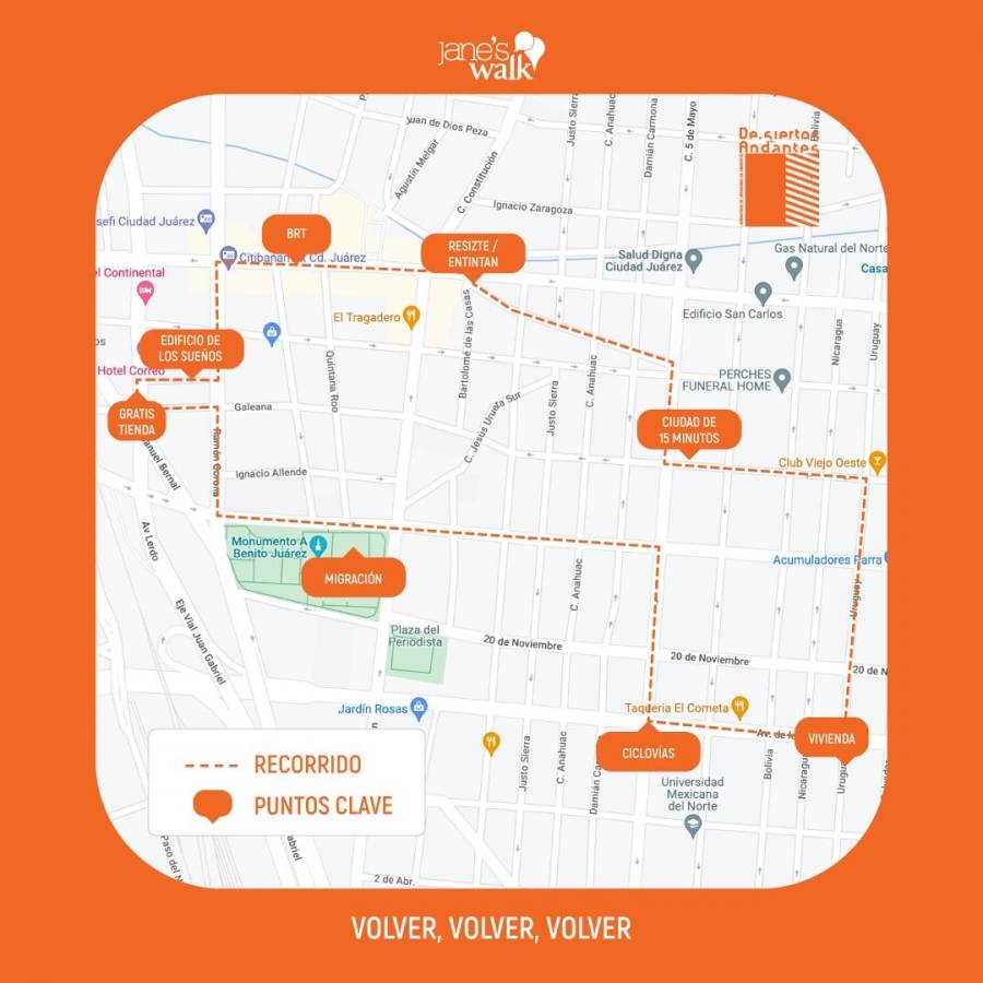 Ciudad Juárez, Chihuahua.— Luego de una pausa de dos años, el proyecto para vivir, analizar y caminar la ciudad nombrado Jane’s Walk, regresa esta semana a cargo del colectivo De.siertos Andantes. Esta iniciativa, que se realiza en Juárez desde 2016, consiste en caminar por diferentes zonas de la ciudad para reflexionar sobre la misma, sobre los cambios que ha sufrido, las mejoras que ha tenido y las cosas que permanecen. “Son ejercicios exploratorios. Los hacemos para analizar la identidad del barrio y de la ciudad, otras caminatas son ejercicios para observar las calles y analizar las condiciones de las calles, una especie de denuncia sobre el espacio público a través de la caminata”, dice Denisse Ortega, integrante del colectivo. En esta ocasión se llevarán a cabo tres caminatas los días viernes 6, sábado 7 y domingo 8 del presente mes. La primera, llamada La border y el río: regresar a la frontera, será en el primer cuadro de la ciudad y estará a cargo del artista urbano Jorge “Yorch” Pérez. La caminata del viernes comenzará a las 11:00 de la mañana en el edificio de la Presidencia Municipal, ubicado en la avenida Francisco Villa #950, Norte. Quienes asistan podrán caminar sobre el bordo fronterizo que divide a Ciudad Juárez y a El Paso, Texas para recordar los eventos artísticos que se han hecho en dicho espacio. Volver, volver, volver es el nombre de la caminata del sábado 7 que será en el Centro Histórico; esta iniciará al mediodía en la Plaza Cervantina, situada entre la avenida Lerdo y Ramón Corona.