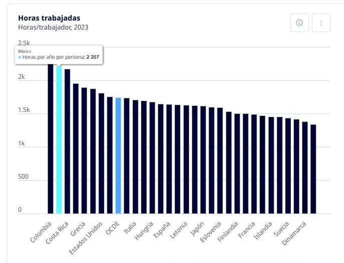 Anualmente una persona trabajadora en México trabaja 2 mil 207 horas, superando por mucho a países como Estados Unidos con mil 805 horas al año, Canadá con mil 694 y Finlandia con mil 497 horas. En los últimos puestos de la OCDE, Alemania destina mil 335 horas al año y Dinamarca mil 380.