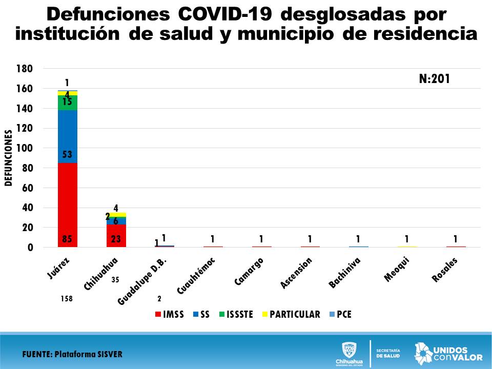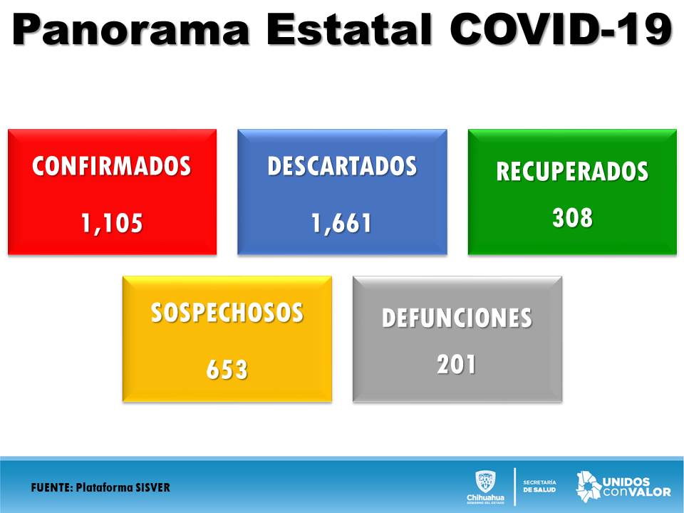 Chihuahua, Chihuahua.— Autoridades de la Secretaría de Salud estatal informaron hoy que se han confirmado en Chihuahua mil 105 casos de COVID-19, así como 201 muertes, 653 casos sospechosos y 281 personas hospitalizadas, de las cuales 172 están graves. En Juárez se reportan 672 casos positivos, 158 muertes y 181 recuperados; no se confirmaron más muertes en este municipio en comparación con la cifra reportada ayer, pero sí otros 32 contagios.