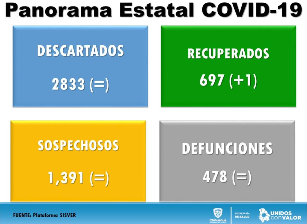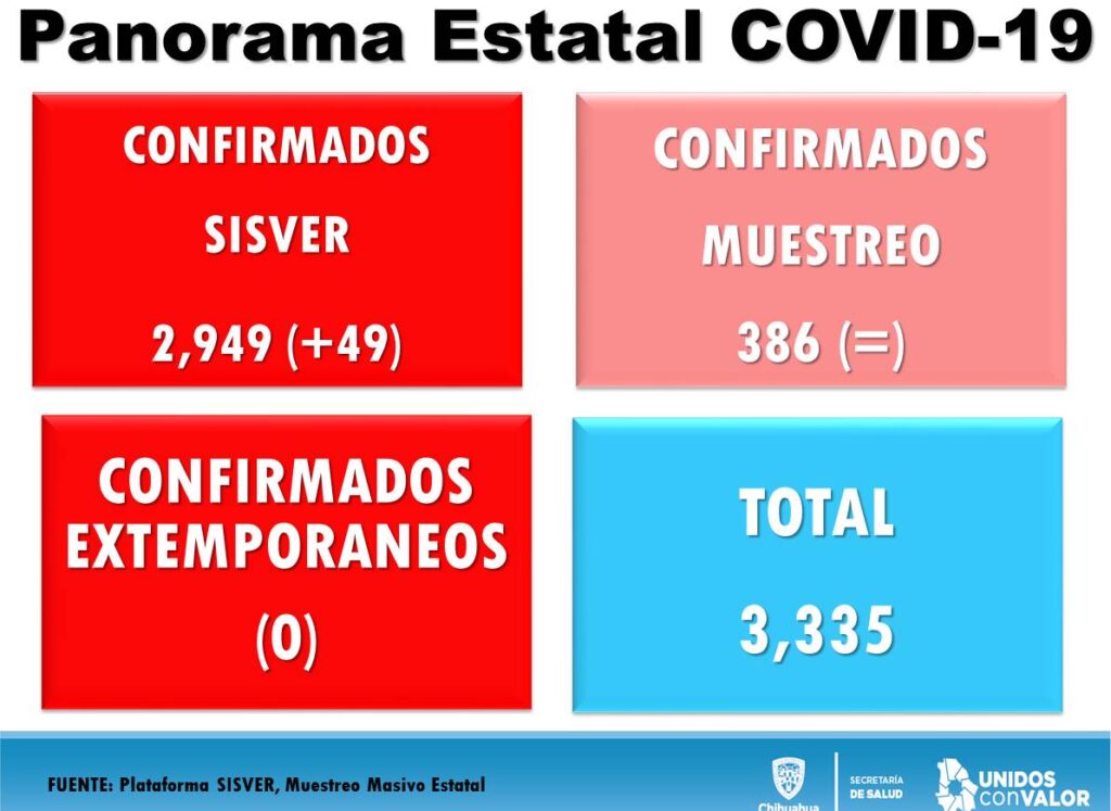 Ciudad Juárez, Chihuahua.— Hasta el momento se tiene el registro de 2 mil 949 casos positivos de COVID-19 en el estado, de acuerdo con el director médico de la Zona Norte, Arturo Valenzuela Zorrilla, de los cuales mil 855 corresponden Ciudad Juárez, 719 a Chihuahua, 91 a Parral y los demás se dividen en otros municipios. Con respecto a la estadística del día anterior se sumaron 49 casos positivos en el estado, 18 para la ciudad de Chihuahua y 7 para Ciudad Juárez, sin nuevas defunciones. Del total de municipios, 37 tienen al menos un caso de contagio, mientras que 19 cuentan con al menos una defunción, explicó Valenzuela Zorrilla. Respecto al número de defunciones, explicó que han perdido la vida a causa del virus 478 personas en el estado, de las 388 tenían residencia en Ciudad Juárez, 61 en Chihuahua, 6 en Meoqui, 3 en Hidalgo del Parral, 3 en Delicias, 2 en Cuauhtémoc, 2 en Camargo, 2 en Guadalupe, 1 en Nuevo Casas Grandes,1 en Ojinaga, 1 en Bachíniva, 1 en Ascensión, 1 en Madera, 1 en Buenaventura, 1 en Ignacio Zaragoza, 1 en Rosales, 1 en Coronado, 1 en San Francisco del Oro y 1 Valle de Zaragoza. También se dio a conocer en la conferencia de prensa que hay 216 pacientes que se encuentran hospitalizados, y que de estos 63 se encuentran intubados, de acuerdo con la información proporcionada por 23 hospitales.