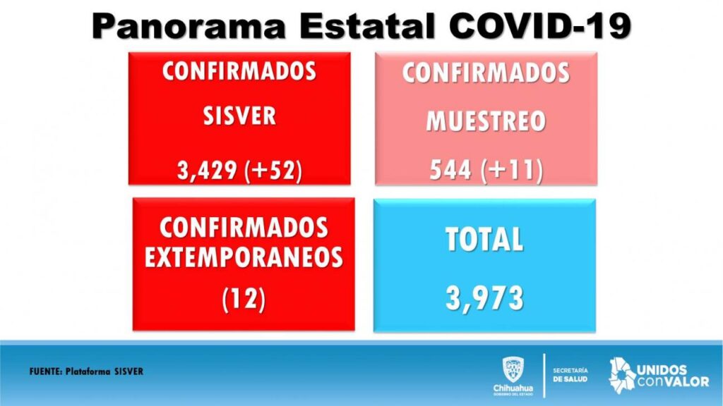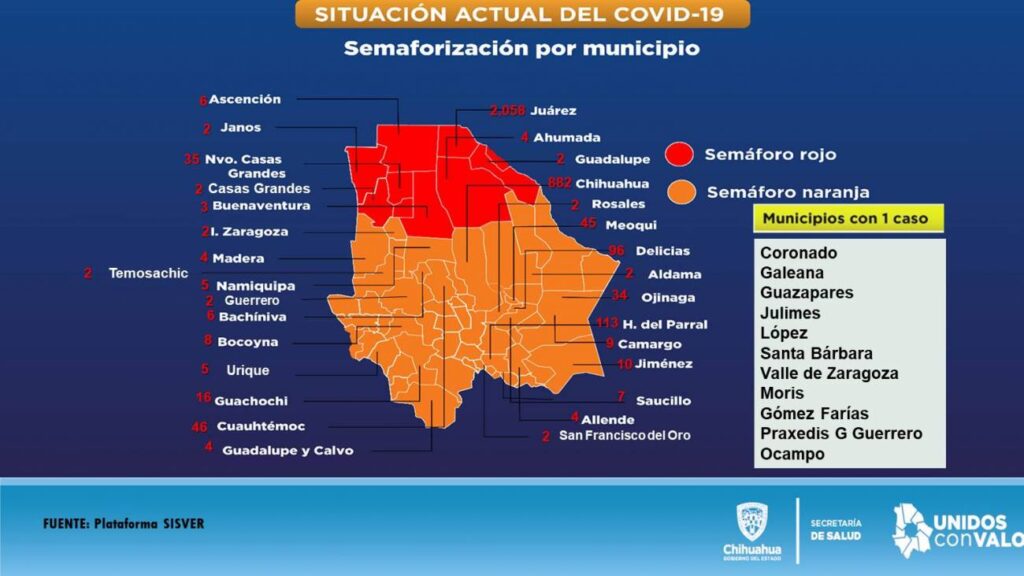 El número de confirmados por municipio se desglosa de la siguiente manera: 2 mil 058 Juárez, 882 Chihuahua, 6 Bachíniva, 46 Cuauhtémoc, 34 Ojinaga, 5 Namiquipa, 45 Meoqui, 1 Julimes, 9 Camargo, 7 Saucillo, 4 Ahumada, 2 Guadalupe D.B., 16 Guachochi, 96 Delicias, 6 Ascensión, 2 Guerrero, 8 Bocoyna, 4 Madera, 113 Parral, 3 Buenaventura, 2 Temósachi, 1 Galeana, 4 Guadalupe y Calvo, 35 NCG, 2 Rosales, 10 Jiménez, 2 Aldama, 1 Santa Bárbara, 2 Ignacio Zaragoza, 1 López, 5 Urique, 2 Janos, 2 San Francisco del Oro, 1 Guazapares, 4 Allende, 1 Coronado, 1 Valle de Zaragoza, 2 Casas Grandes, 1 Moris, 1 Gómez Farías, 1 Praxedis G. Guerrero y 1 Ocampo. Mientras que las personas fallecidas se registran de la siguiente manera de acuerdo con el municipio de residencia: 447 Juárez, 79 Chihuahua, 3 Cuauhtémoc, 2 Guadalupe D.B., 2 Ascensión, 2 Camargo, 1 Rosales, 1 Bachíniva, 7 Meoqui, 1 Buenaventura, 4 Delicias, 1 Ignacio Zaragoza, 1 San Francisco del Oro, 3 Parral, 1 Madera, 1 Coronado, 1 NCG, 1 Ojinaga, 1 Valle de Zaragoza, 1 Bocoyna, 1 Saucillo y 1 Moris. El número de personas fallecidas por rango de edad es: 1 de 5-9 años; 79 de 25-44; 268 de 45-64; 65 de 65-69; 55 de 70-74; 37 de 75-79; 34 de 80-84,; 12 de 85-89 y 11 mayores de 90. 37% mujeres y 63% hombres. Hasta el momento 42 municipios tienen casos confirmados, luego de que se agregó Ocampo con un caso; en 22 de ellos han ocurrido decesos.