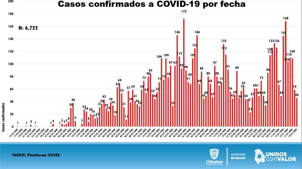 Ciudad Juárez, Chihuahua.— La Secretaría de Salud informó hoy que el estado alcanzó un total de 6 mil 722 casos confirmados de COVID-19, en tanto que se llegó a las 819 defunciones derivadas de la enfermedad. Al último corte, es decir en un lapso de 24 horas, en la ciudad de Chihuahua se registraron 15 nuevos casos, con lo que la ciudad alcanza los mil 656 casos totales acumulados. En Juárez se sumaron 23 casos para llegar a 3 mil 738, indicó la doctora Leticia Ruiz, subdirectora de Prevención y Promoción de la Salud.