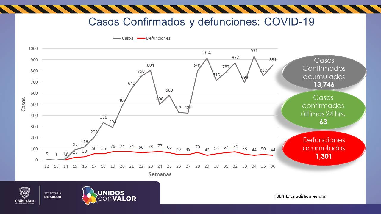 Ciudad Juárez, Chihuahua.— El municipio de Juárez acumula 6 mil 807 casos positivos de COVID y 824 muertes a causa de la enfermedad, luego que se sumaran dos en el último día, informó la Secretaría de Salud estatal. En total, el estado de Chihuahua suma 13 mil 743 casos confirmados desde el inicio de la pandemia (se añadieron 63 en el último día) y mil 301 fallecimientos. Durante la conferencia diaria de la Secretaría se informó que en las últimas 24 horas se añadieron también 72 personas que han logrado superar la enfermedad, que ahora suman 7 mil 23, más del 50% de los contagiados. Asimismo han sido descartados 9 mil 841 casos con pruebas de PCR y 3 mil 803 permanecen sospechosos.