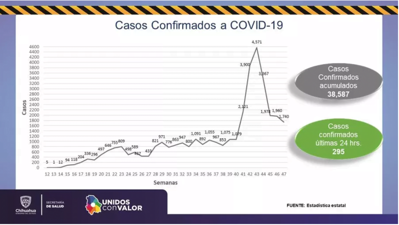 Ciudad Juárez, Chihuahua.— En las últimas 24 horas se confirmaron 295 nuevos contagios de COVID-19 en el estado, así como 50 defunciones, de las que 30 se presentaron en Ciudad Juárez, 7 en Chihuahua, 5 en Parral, 3 en Delicias, 2 en Guachochi y una en Cuauhtémoc, Camargo y San Francisco del Oro, confirmaron las autoridades de la Secretaría de Salud. De acuerdo con el director médico de la Zona Norte, Arturo Valenzuela Zorrilla, con estos nuevos casos en el estado se acumulan 38 mil 587 casos confirmados de COVID-19 desde que inició la pandemia, mientras que van 3 mil 547 defunciones. Con respecto a la gráfica de defunciones confirmadas de COVID-19 mencionó que la curva muestra un ascenso logarítmico que coincide con la explosión de casos que se dio en las semanas 43 y 44: