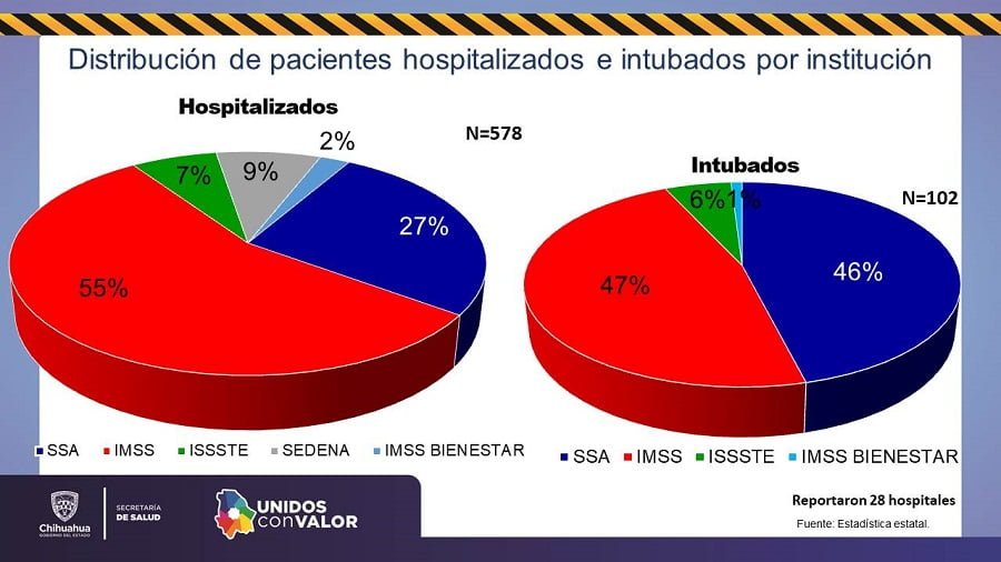 En cuanto al número de personas fallecidas por municipio de residencia se encuentran de la siguiente manera: 2 mil 113 Juárez, 691 Chihuahua, 165 Delicias, 116 Cuauhtémoc, 116 Parral, 49 NCG, 35 Meoqui, 35 Camargo, 30 Saucillo, 18 Guerrero, 12 Ascensión, 17 Jiménez, 9 Rosales, 13 Guachochi, 7 Ahumada, 6 Bocoyna, 7 Ojinaga, 5 Carichí, 5 Namiquipa, 5 Temósachic, 6 A. Serdán, 7 Buenaventura, 6 Madera, 5 CG, 4 Galeana, 4 Ocampo, 4 Urique, 4 G. Farías, 4 San Fco. del Oro, 3 R. Palacio, 3 Janos, 4 Julimes, 5 Aldama, 3 Coronado, 3 Guadalupe D.B., 2 I. Zaragoza, 3 Cusihuiriachi, 2 Dr. B. Domínguez, 3 Coyame, 1 Moris, 1 Allende, 1 Balleza, 1 Matachi, 1 Bachíniva, 1 Guazapares, 1 V. de Zaragoza, 1 S. Isabel, 2 López, 3 San Fco. de Conchos, 2 S. Bárbara, 1 Guadalupe y Calvo, 1 Gran Morelos y 1 Nonoava. Al último corte también se dio a conocer que hay 578 pacientes hospitalizados por COVID-19 de los que 102 se encuentran en estado grave e intubados.