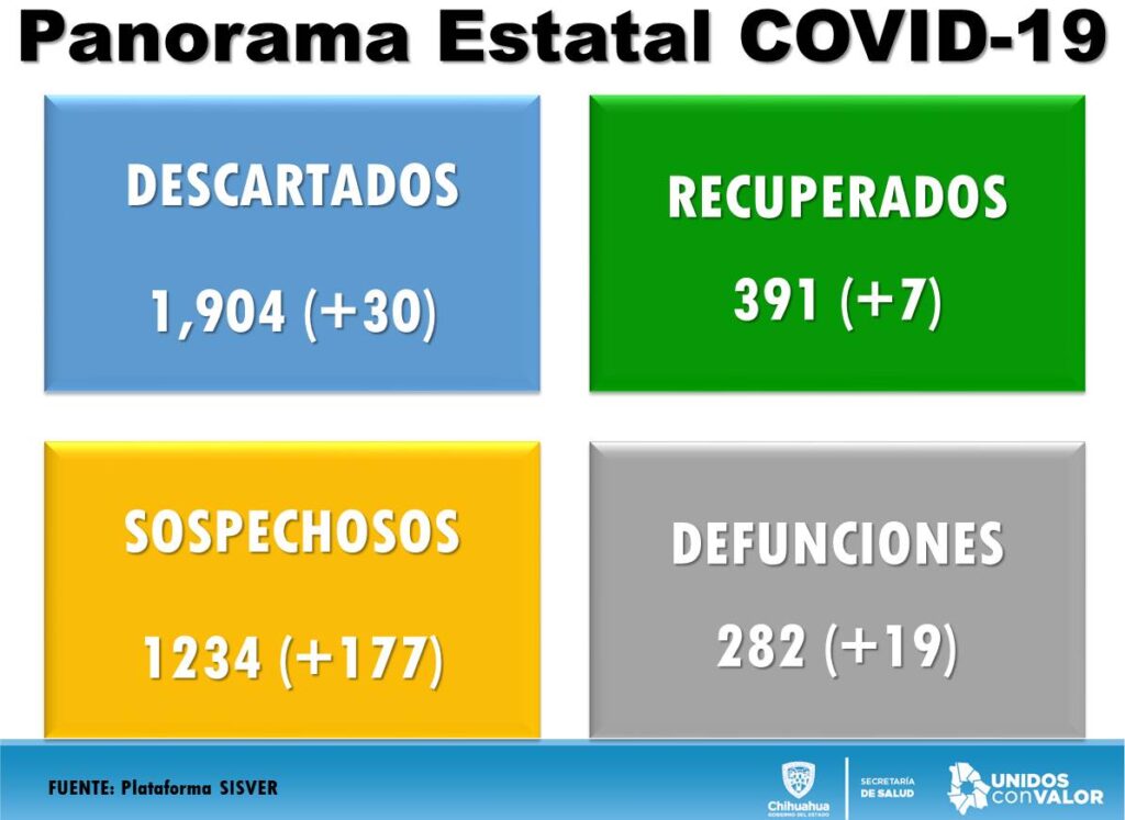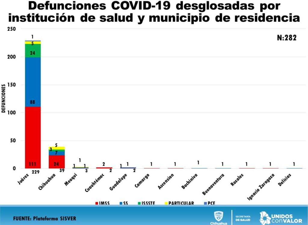 Ciudad Juárez, Chihuahua.— De acuerdo con el reporte que presentó este día la Secretaría de Salud de Gobierno del Estado, hasta ayer se tenía el registro de mil 565 casos confirmados por COVID-19 en el estado, así como 282 fallecimientos y 391 recuperados. A nivel local, Juárez registra 942 casos positivos por contagio de COVID, 229 fallecimientos y 224 personas recuperadas, dio a conocer el director médico de la Zona Norte, Arturo Valenzuela Zorrilla, durante la rueda de prensa informativa que se realiza de manera digital.