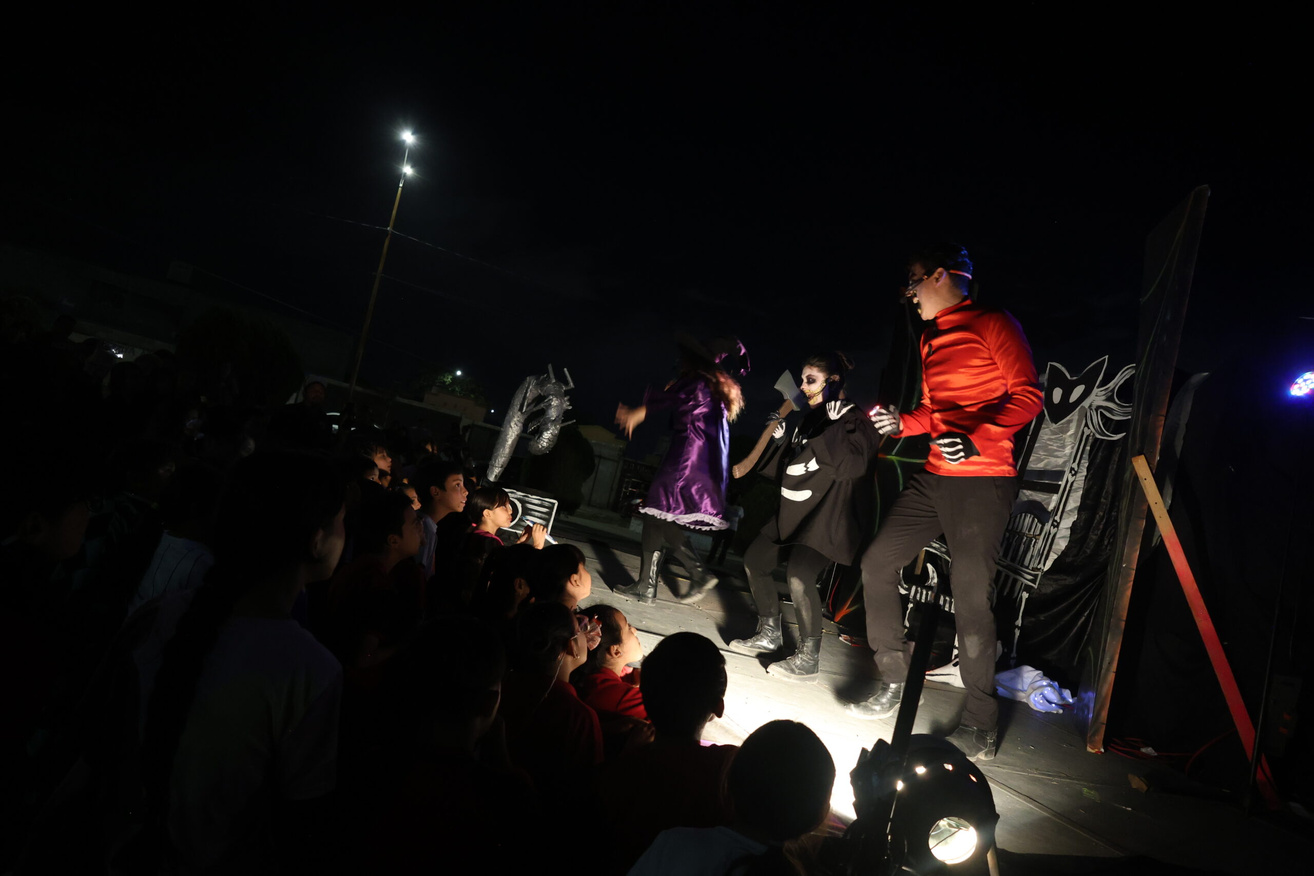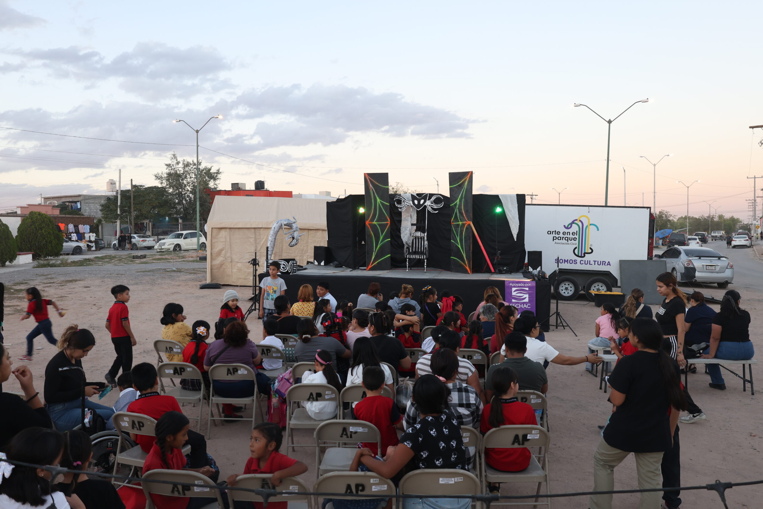 Habitantes de tres colonias del suroriente disfrutan de las funciones de teatro al aire libre presentadas por AREG Producciones con la obra ‘Pesadilla antes de Navidad’, como parte del programa organizado por la asociación Arte en el Parque.