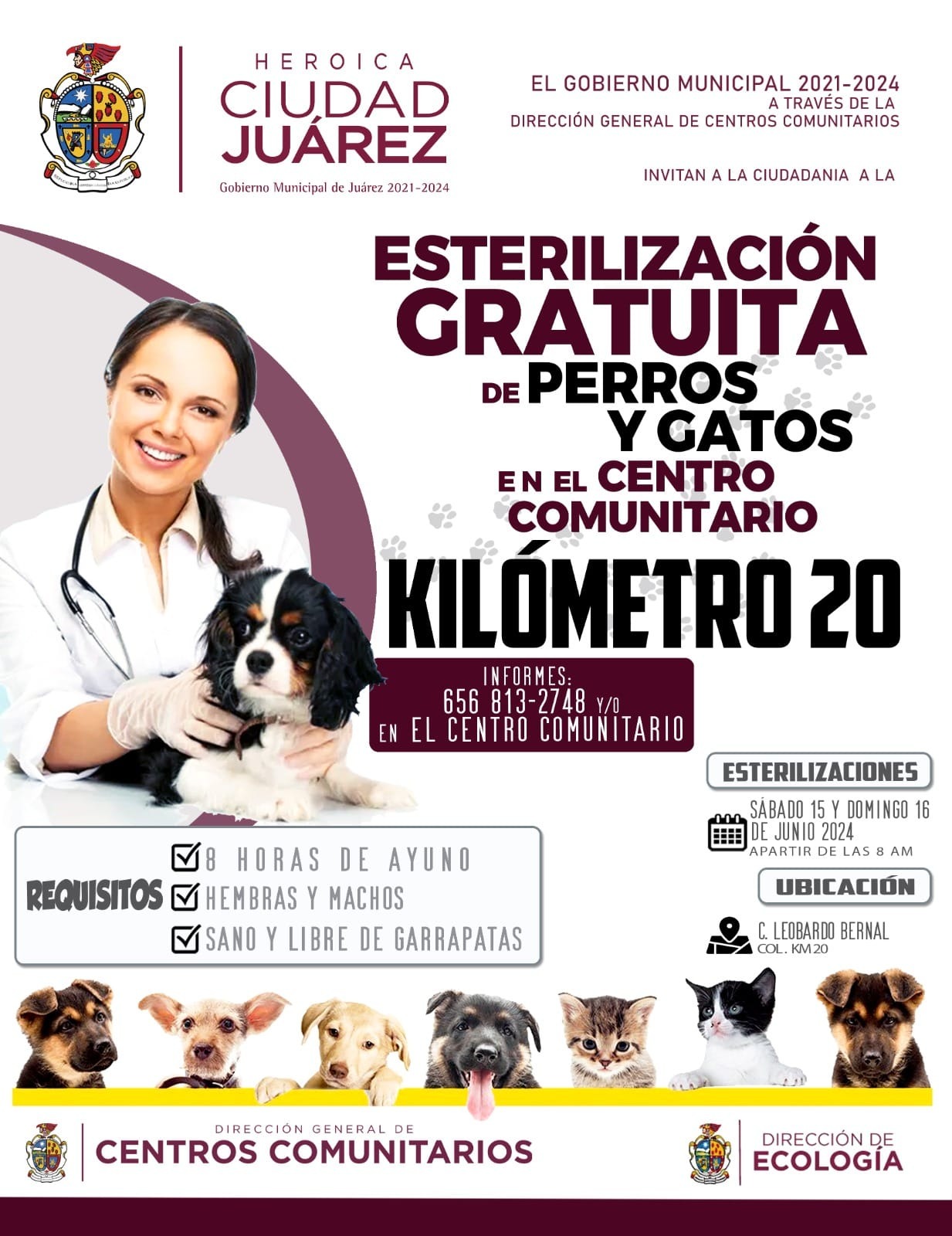 Ciudad Juárez, Chihuahua.– La Dirección General de Centros Comunitarios informó que este fin de semana llevará al centro comunitario municipal Kilómetro 20 la jornada de esterilización gratis para perros y gatos.