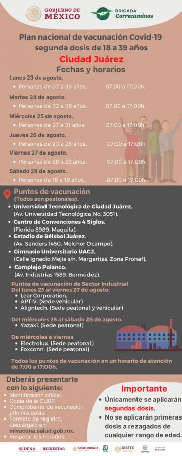 Ciudad Juárez, Chihuahua.- A partir del lunes 23 de agosto iniciará la jornada de vacunación contra COVID-19 para la aplicación de la segunda dosis a personas de 18 a 39 años, informó la Delegación Estatal de Programas para el Desarrollo del Gobierno Federal. Desde las 7:00 de la mañana y hasta las 5:00 de la tarde se atenderá a la población que ya tenga la primer dosis del biológico en cualquiera de los cinco puntos de vacunación establecidos. Estas son las fechas en las que vacunarán a las personas de 18 a 39 años de edad: