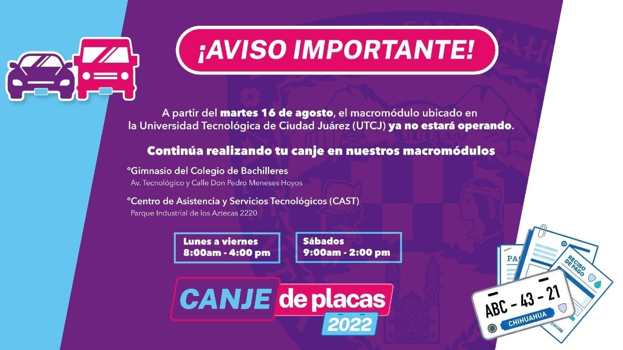 Ciudad Juárez, Chihuahua.— El macromódulo para el canje de placas de la Universidad Tecnológica de Ciudad Juárez (UTCJ) cerrará a partir de mañana, martes 16 de agosto, informaron a través de la página oficial de Facebook del Gobierno de Chihuahua Zona Norte.