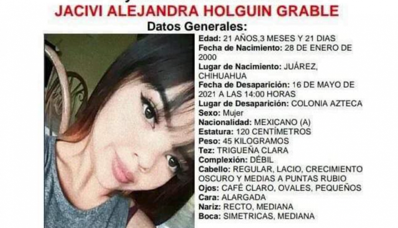 Ciudad Juárez, Chihuahua.— Familiares, amigos y conocidos de Jacivi Alejandra Holguín Grable convocan a una marcha la mañana de este sábado para exigir justicia por el asesinato de la mujer de 21 años. Ayer alrededor de las 22:00 horas autoridades estatales localizaron en un kínder de la colonia Mirador el cuerpo sin vida de Jacivi Holguín, tras permanecer desaparecida desde la tarde del pasado domingo, informó la Fiscalía Especializada de la Mujer. En el curso de este día se llevaron a cabo las diligencias para establecer la identificación oficial de la víctima, así como la causa de muerte que se determinó como asfixia por sofocación, dio a conocer la Fiscalía a través de un comunicado. Asimismo el fiscal general del estado, César Augusto Peniche Espejel, informó que hay una “persona sujeta a investigación” en relación con el asesinato. La marcha partirá a las 8:00 de la mañana del Smart Eje Vial, ubicado en Oasis Revolución, y terminará frente a las instalaciones de la Fiscalía de la Zona Norte. Se pide a los asistentes llevar playera y pañuelo morado así como pantalón de mezclilla, gel antibacterial y cubrebocas.