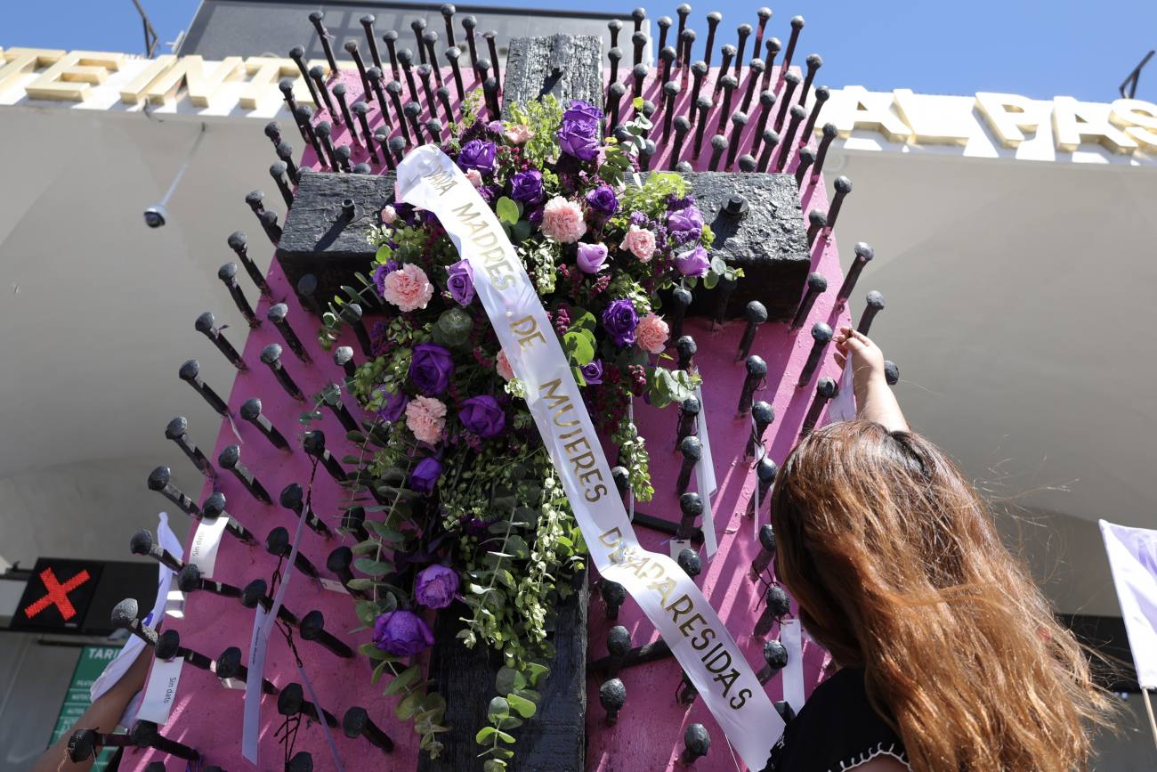 Ciudad Juárez, Chihuahua.— El Movimiento de Mujeres en Ciudad Juárez se manifestó frente a la cruz de clavos para recordar a las mujeres y niñas que han sido asesinadas en lo que va del año y exigir a las autoridades correspondientes que se investiguen los casos con perspectiva de género. 14 nombres de mujeres víctimas de homicidio en hechos violentos fueron enunciados para demandar que se impongan sanciones ejemplares a los perpetradores y que se impulsen acciones de prevención “que reviertan el declive en que se encuentra la vida, seguridad y dignidad de las mujeres y niñas en esta frontera de manera urgente”. Entre ellos se mencionó a la pareja conformada por Nohemí M. M. Y Tania M. H., asesinadas brutalmente y cuyos cuerpos fueron encontrados el 16 de enero sobre la carretera Juárez-Porvenir, en el poblado San Agustín. Asimismo el caso de Leslye Robles Estrada, de 23 años de edad, asesinada el 17 de febrero al exterior de un centro comercial, y el de la estudiante del CBTis 2070, Jessenia Johana C. R., investigado por la Fiscalía Especializada de la Mujer (FEM) como feminicidio. Las integrantes del Movimiento de Mujeres en Ciudad Juárez recalcaron que, según datos de la Fiscalía General del Estado, se han registrado 73 asesinatos dolosos contra mujeres a nivel estatal, de los cuales 41 o el 56 por ciento, sucedieron en Ciudad Juárez.