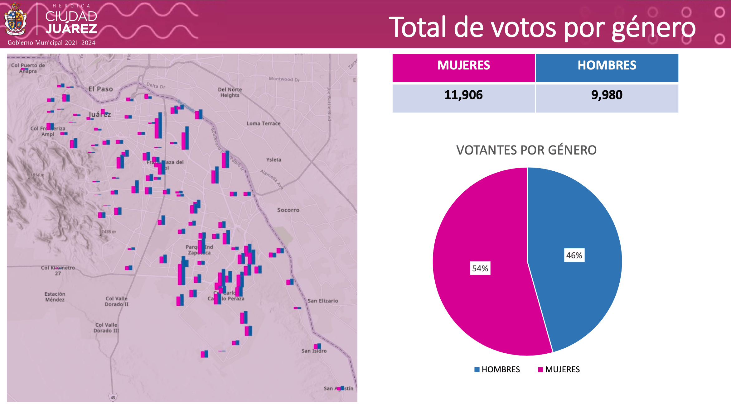 Durante el ejercicio de este Presupuesto Participativo, Red de Vecinos de Juárez acompañó a 65 proyectos, de los cuales 48 fueron impulsados por mujeres, informó la coordinadora de Participación Ciudadana de Plan Estratégico de Juárez, Claudia Arreola Pérez. En las votaciones que se llevaron a cabo el pasado 10 de junio también predominó la participación femenina, pues el Informe de la Jornada de Votación indica que el 54 por ciento de los votos (11 mil 906) fueron emitidos por mujeres, mientras que el 46 por ciento (9 mil 980), por hombres.