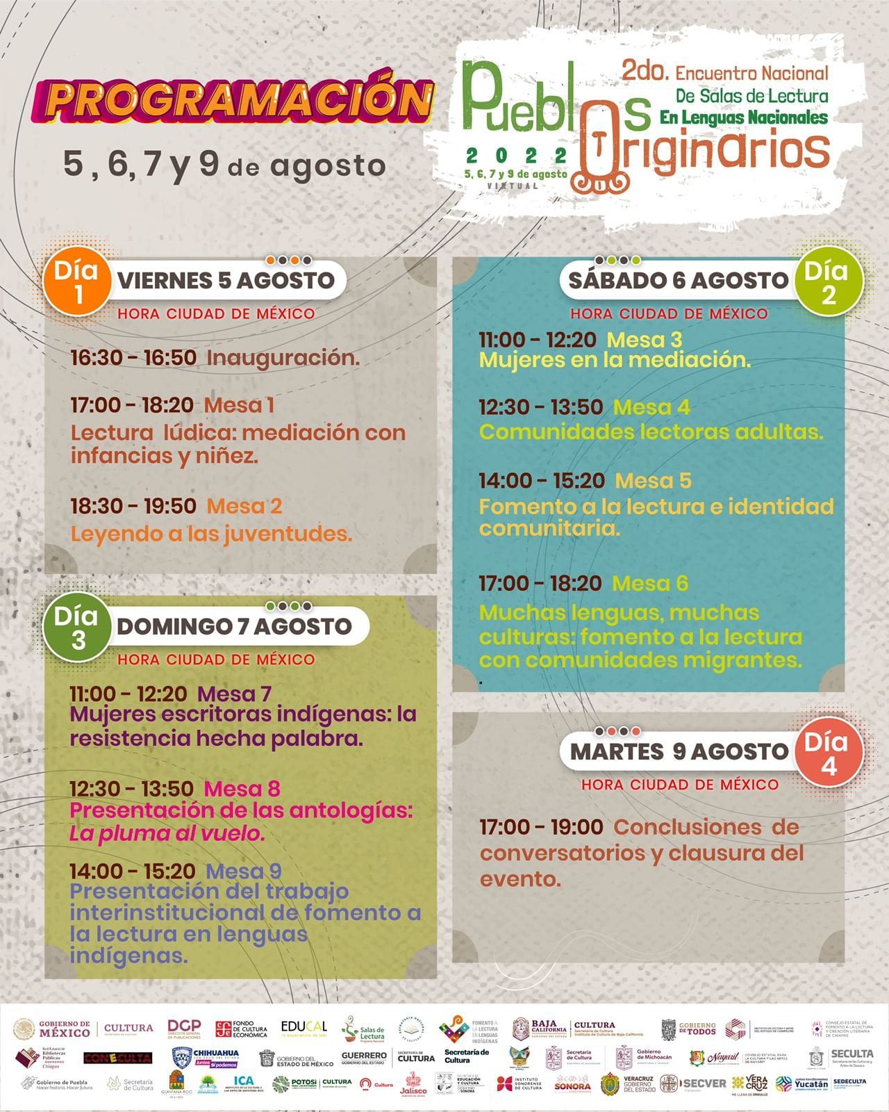 Para mayor información y conocer el programa completo del Segundo Encuentro Nacional de Salas de Lectura en Lenguas Nacionales Pueblos Originarios 2022, visita las páginas de Facebook o comunícate al teléfono (614) 214-4800 ext. 263.