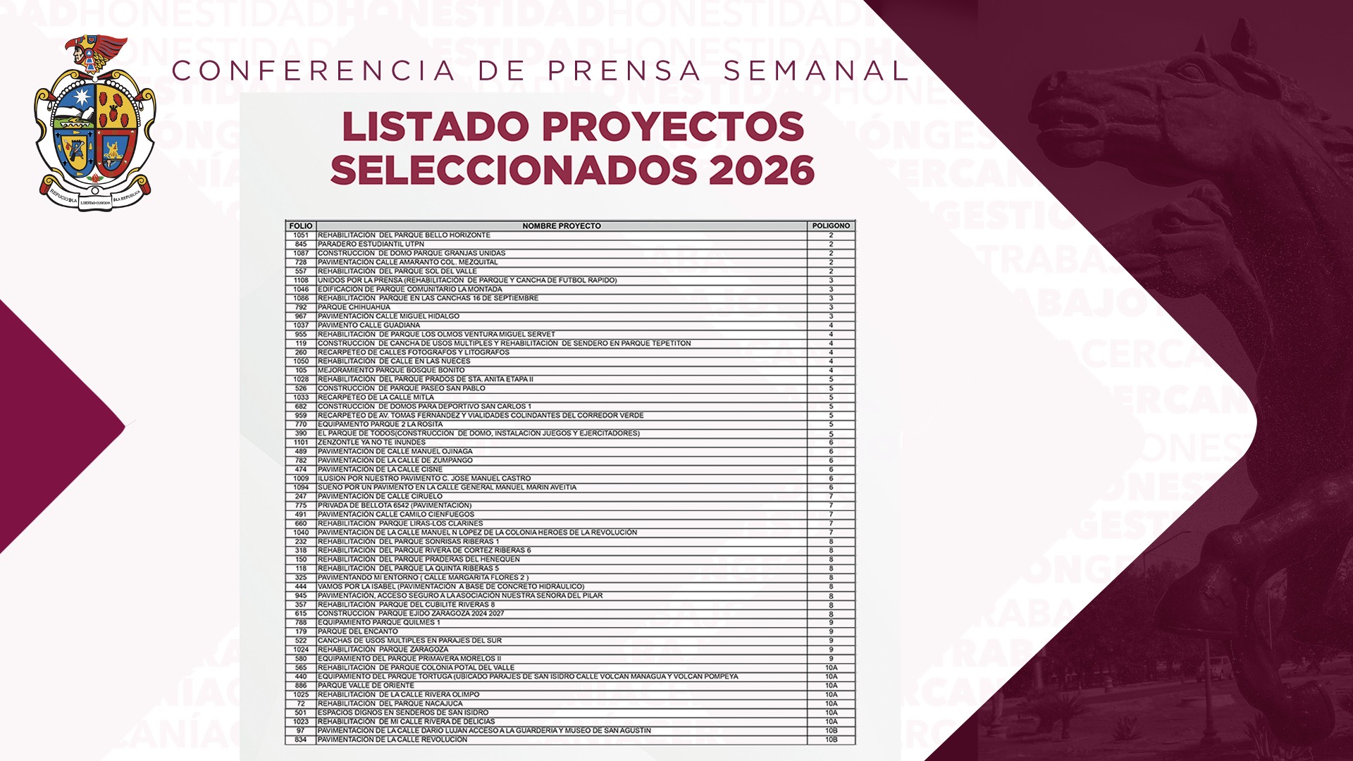 Ciudad Juárez, Chihuahua.– El Gobierno Municipal de Juárez presentó el listado de los proyectos seleccionados para ser ejecutados a través del Presupuesto Participativo 2026 con un total de 561 millones de pesos.