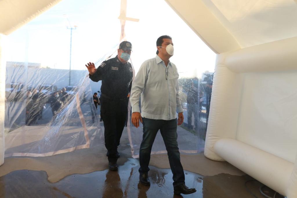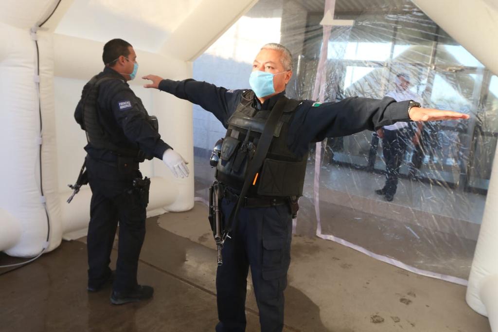 Ciudad Juárez, Chihuahua.— En los seis distritos de la Secretaría de Seguridad Pública Municipal (SSPM) se instalaron túneles inflables de sanitización, con los que el Municipio pretende fortalecer las medidas sanitarias de su personal. Hoy por la mañana el Presidente Municipal, Armando Cabada Alvídrez, y el secretario de Seguridad Pública, Raúl Ávila Ibarra, supervisaron el funcionamiento del túnel colocado en la Estación Universidad.