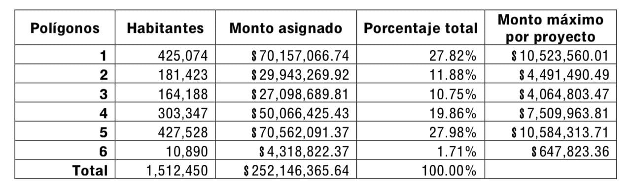 Ciudad Juárez, Chihuahua.- El gobierno municipal de Juárez publicó hoy la convocatoria del Presupuesto Participativo 2022, un mecanismo de participación ciudadana a través del cual la ciudadanía puede proponer y votar por proyectos de obra pública que se financiarán este año con una bolsa de 252 millones 146 mil 365 pesos, correspondientes al cinco por ciento de los ingresos municipales de libre disposición. El total de los recursos se dividirá en cinco polígonos urbanos y uno rural (que considera a las localidades de Samalayuca y San Isidro) previamente definidos por el Instituto Municipal de Investigación y Planeación (IMIP), considerando diversas características sociodemográficas, como el Índice de Marginación Urbana o el Índice de Incidencia Delictiva. De acuerdo con la convocatoria, los polígonos fueron definidos por el IMIP de esta manera: Asimismo se específica que las propuestas de la ciudadanía deben atender necesidades colectivas, y su monto máximo de financiamiento no debe superar el  15 por ciento del total destinado a cada polígono. Los montos asignados por polígono quedaron de esta manera: Las propuestas deben incluir justificación, ubicación, población beneficiaria estimada, costo aproximado y estar enfocadas a cubrir necesidades colectivas relacionadas con obras y servicios públicos, seguridad, actividades recreativas, deportivas y culturales, infraestructura rural y urbana, recuperación de espacios públicos, medio ambiente, seguridad sanitaria y servicios de salud, y atención a grupos vulnerables. El periodo para la presentación de proyectos será del 22 de marzo al 11 de abril y no se aceptarán entregas en plazos extraordinarios. Las propuestas se pueden entregar en ventanilla única de la Coordinación de Participación Ciudadana, ubicada en la Presidencia Municipal (de 8:00 AM a 3:00 PM), o en los centros comunitarios Felipe Ángeles, Eréndira, Granjas de Chapultepec, Ampliación Aeropuerto, Frida Kahlo, Samalayuca, Riberas del Bravo (de 9:00 AM a 5:00 PM). Un Comité Técnico Evaluador conformado por distintas dependencias municipales se encargará de analizar la viabilidad de las propuestas ciudadanas. En caso de que algún proyecto este fuera del área de especialidad de las dependencias, el Comité podrá llamar a integrantes de colegios de profesionistas, investigadores o académicos. A continuación te compartimos la convocatoria completa para el Presupuesto Participativo 2022. También puedes consultarla en la página oficial del gobierno municipal en este enlace. Convocatoria 2022_15_03_22