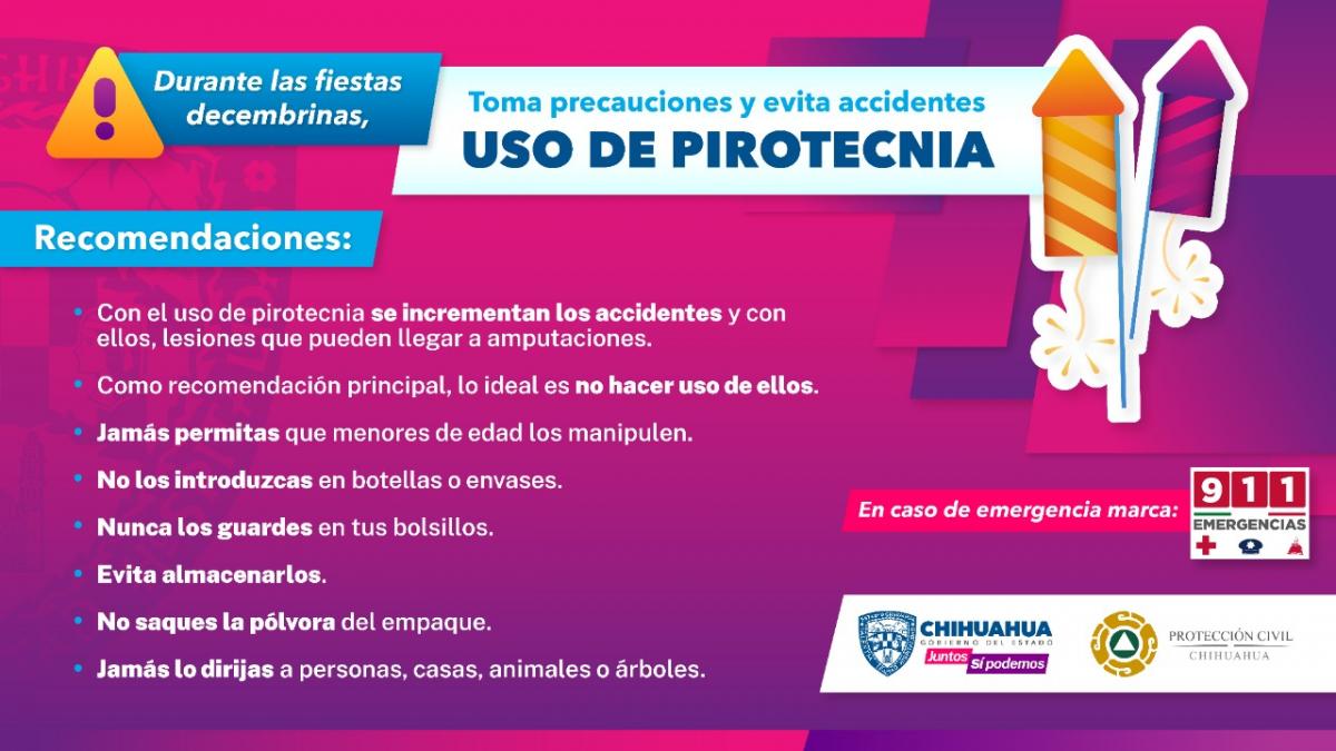Ciudad Juárez, Chihuahua.— Con el objetivo de evitar accidentes durante las fiestas de fin de año, la Coordinación Estatal de Protección Civil (CEPC) exhortó a la ciudadanía a no utilizar pirotecnia. Además de contaminar el medio ambiente, el mal uso de la pirotecnia puede ocasionar lesiones en las personas que la manipulan, como quemaduras, lesiones auditivas, pérdida de extremidades o incluso la muerte, indicó la CEPC. La Coordinación Estatal recalcó sobre el riesgo que representan dichos explosivos cuando son utilizados bajo los efectos del alcohol, así como guardarlos en los bolsillos de la ropa y al permitir que niñas y niños los usen. Los sonidos de explosión que generan también afectan a personas con autismo, a quienes tienen sensibilidad auditiva y a las mascotas; los efectos del ruido de la pirotecnia causan diferentes efectos que pueden ser muy perjudiciales. En el mismo sentido, la Dirección de Ecología del Municipio, como responsable del bienestar animal en la ciudad, pidió a la comunidad no usar estos explosivos pues las aves también resultan afectadas al presentar taquicardia, lo que puede llevarlas a la muerte. La directora de Ecología, Yesenia Anaya Retana, explicó que en el caso de los perros la pirotecnia puede ocasionar ladridos compulsivos, babeo excesivo, agresividad, incontinencia, convulsiones y llanto, pues el estruendo les genera altos niveles de estrés. Aunque se espera que la ciudadanía se abstenga de usarlos, en caso de algún accidente deben comunicarse inmediatamente al número de emergencias 911 o bien, acudir a la unidad de salud más cercana.