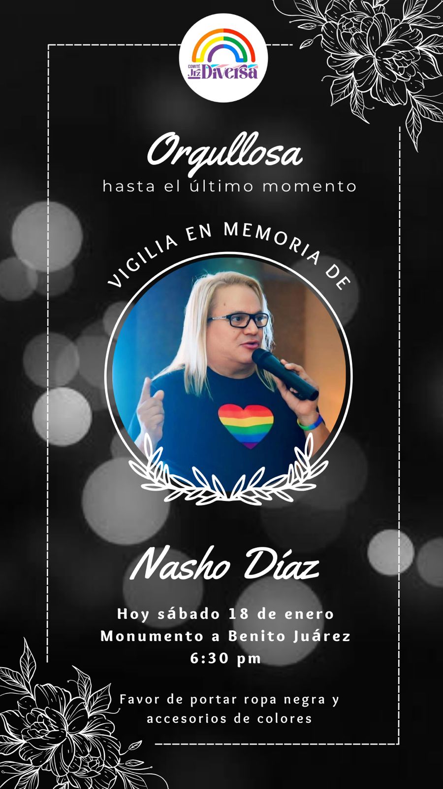 El Comité Juárez Diversa convoca a una vigilia en memoria de Nasho Díaz, el día de hoy 18 de enero a las 6:30 de la tarde en el Monumento a Benito Juárez.